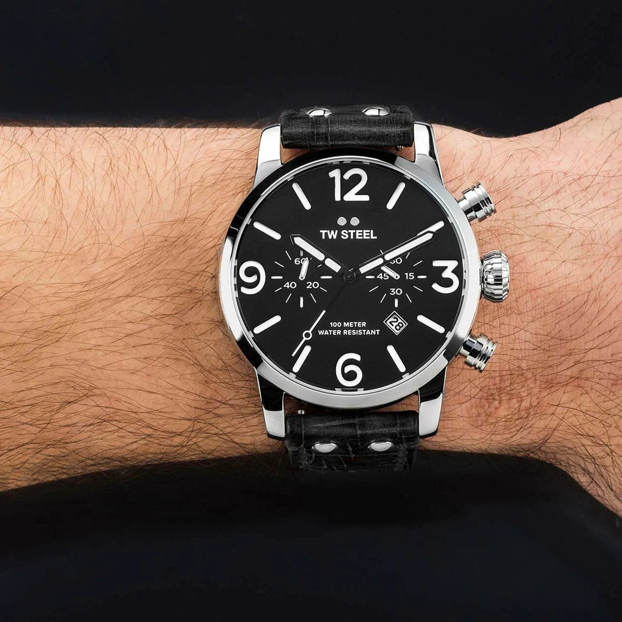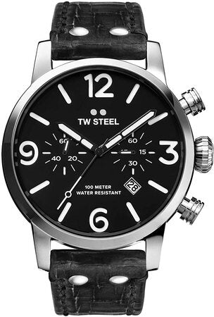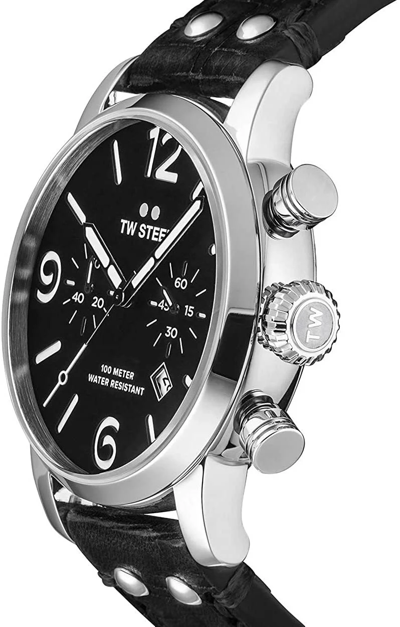 Cut loose, be bold and let the good times roll. This new Maverick features a big caliber chrono movement, a black sandwich dial and a black vintage leather strap with Quick Change Construction.