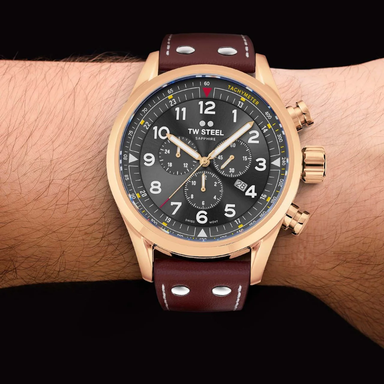 Forget the destination, live the journey.This Swiss Volante model features a 48mm shinny PVD rose gold plated steel case with sapphire crystal and a sunray grey dial. It is powered by a Swiss made chronograph movement and stands out with a reddish brown, Italian calf leather strap.