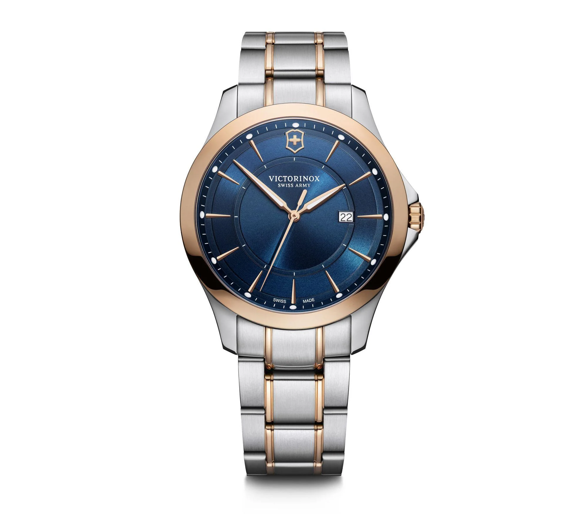 Refined and enduring, the Victorinox Alliance Watch 241911 is a men’s watch crafted with Swiss precision and minimalist sophistication. The striking blue dial is framed by a 40mm round case and protected by scratch-resistant sapphire crystal, offering both clarity and resilience. Its two-tone stainless steel bracelet blends silver-tone with subtle rose gold accents, delivering a polished yet understated look suitable for any setting. Featuring a reliable analog quartz movement and a discreet date display, it balances function with elegance. Built to perform under pressure, it is water-resistant up to 100 meters and has passed 100 homologation tests, ensuring lasting durability. With its ergonomic design and 5-year international warranty, this timepiece stands out in the dress watch category as a timeless essential for the modern gentleman.