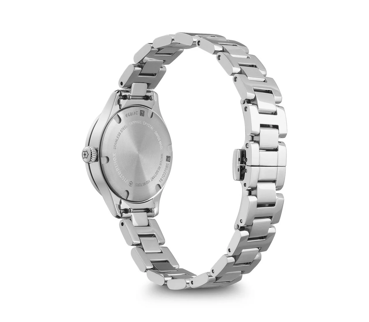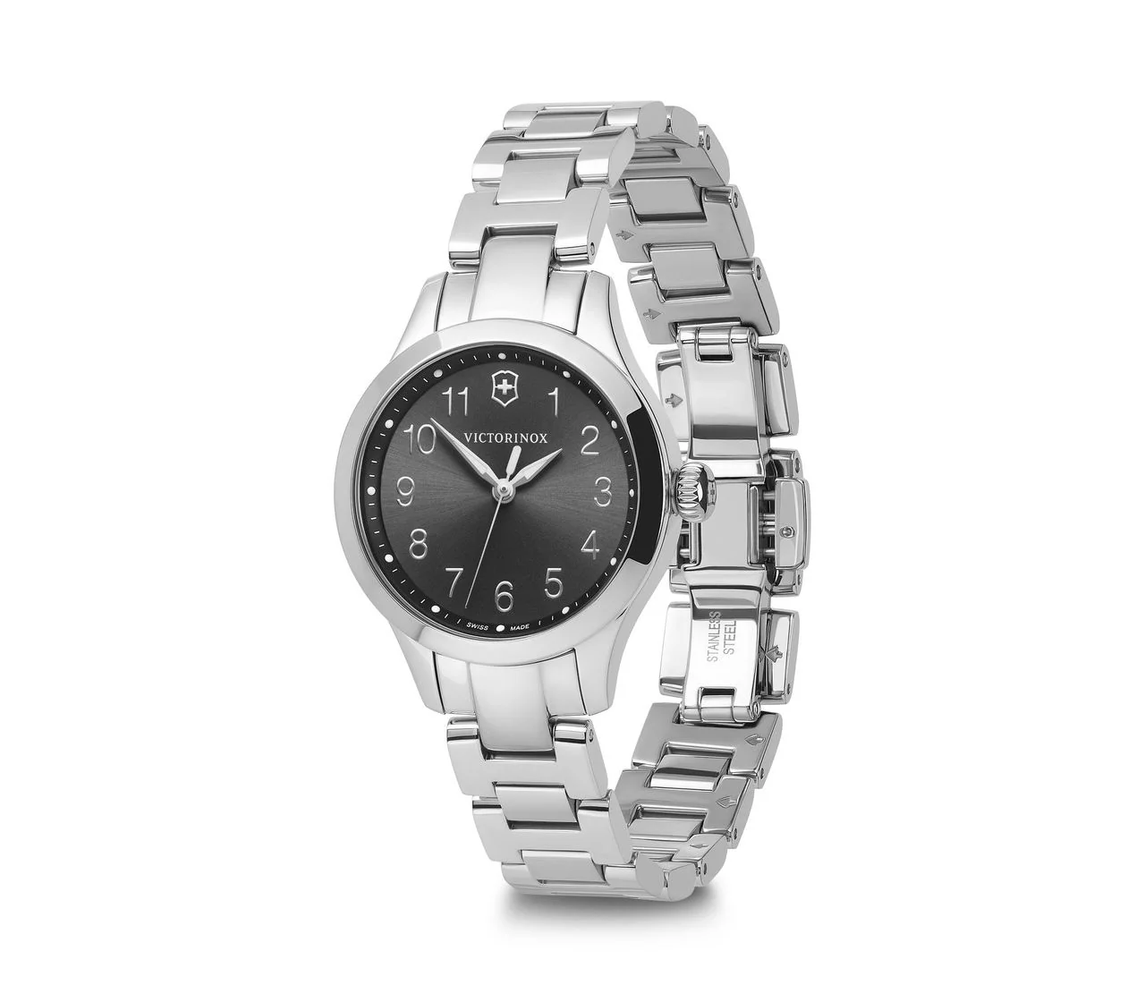 The Victorinox Alliance XS women’s watch is a masterclass in refined minimalism, blending Swiss precision with timeless elegance. Designed for women who value subtle sophistication, its 28mm stainless steel case houses a black sunray brushed dial that radiates quiet confidence. The silver bracelet pairs seamlessly with the polished finish, offering a graceful accessory equally suited for casual or dress occasions. Scratch-resistant sapphire crystal with triple anti-reflective coating ensures lasting clarity, while Super Luminova accents enhance readability in any light. With quartz movement, a screw-in caseback, and 100-meter water resistance, this timepiece combines durability with understated beauty, making it a standout in the women’s watch category.