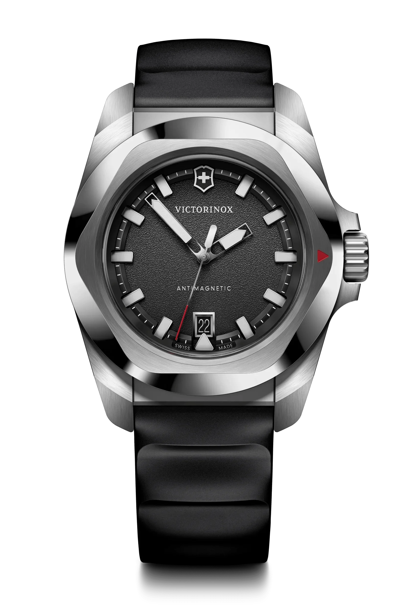 Victorinox I.N.O.X. Quartz carries the brand’s iconic Swiss heritage and precision engineering. Built to endure with 200 m water resistance, anti-shock and antimagnetic features, this timepiece is crafted in Switzerland for everyday resilience and lasting impact. The matte dial with raised indexes and luminous hands ensures day-to-night readability, complemented by a date display at 6 o’clock. A brushed and polished bezel with anti-scratch treatment adds refinement, while an interchangeable rubber strap delivers versatile, comfortable wear. A refined choice for a men’s watch that balances heritage with modern durability.