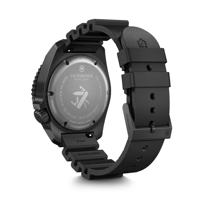 Luminous hands and markers enhance readability in low-light environments, and the sandblasted black titanium bezel adds a sleek, stealth-like finish. The sapphire crystal glass offers superior scratch resistance, and the regular buckle closure ensures a secure fit. With a profile height of 14 mm and a lug width of 21 mm, this timepiece is as comfortable as it is resilient. The Victorinox Dive Pro sets a new standard for dive watches—sophisticated, durable, and ready for any challenge.