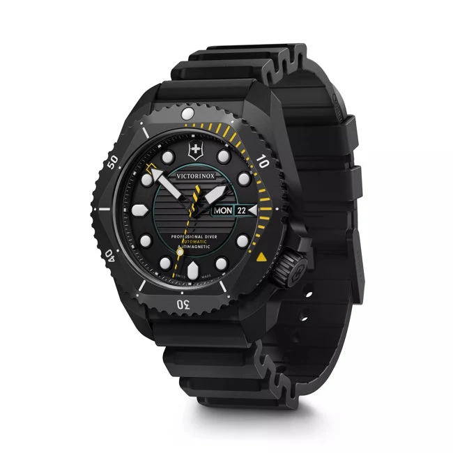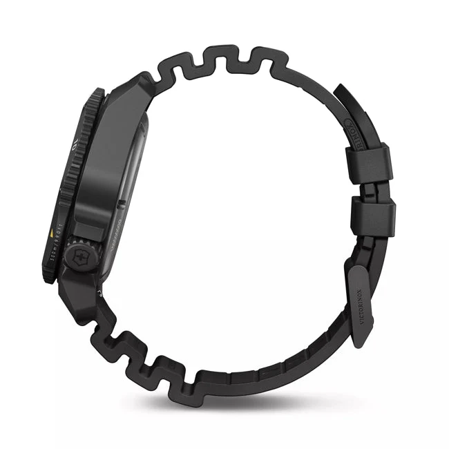 Engineered for performance and designed with refined utility, the Victorinox Dive Pro Automatic 241997 is a bold expression of Swiss precision and functionality. This men’s watch features a robust 43mm titanium case with a matte black dial and matching black rubber strap, merging rugged durability with modern style. Powered by automatic movement, it eliminates the need for batteries, while its 300-meter water resistance and screw-in titanium caseback ensure reliability in the most demanding diving conditions.
