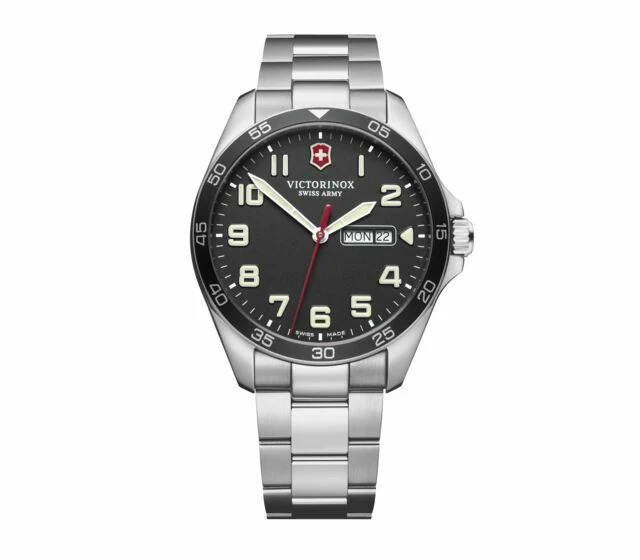 Discover the Victorinox Fieldforce Day Date 241849, a men’s watch that epitomizes the perfect blend of durability and sophistication. Crafted from stainless steel, this timepiece features a striking black dial adorned with bold Arabic numerals and a signature Swiss Army cross, ensuring optimal readability. The 42mm case houses a precise quartz movement and is protected by scratch-resistant sapphire crystal, making it suitable for various environments, from rugged outdoor adventures to formal gatherings. Enhanced with Super-LumiNova® technology, the watch shines in low-light conditions, while the day-date function keeps your schedule on track. With water resistance up to 100 meters, embrace a watch that is as versatile as it is stylish, ideal for those who appreciate quality and craftsmanship.