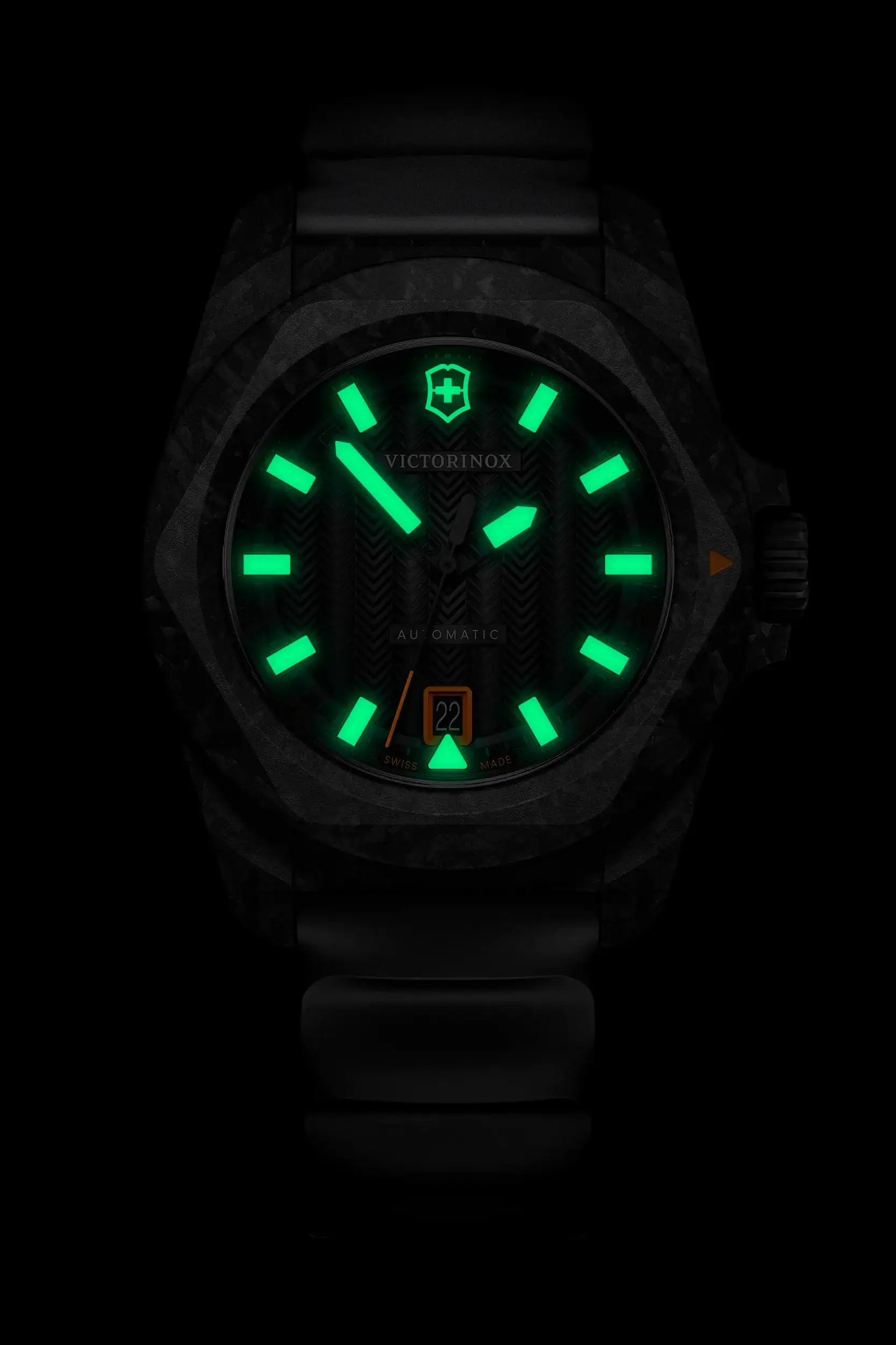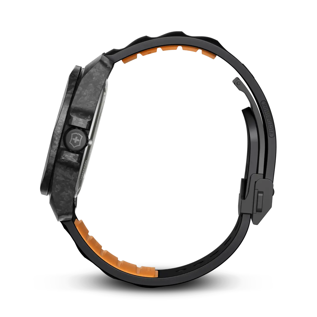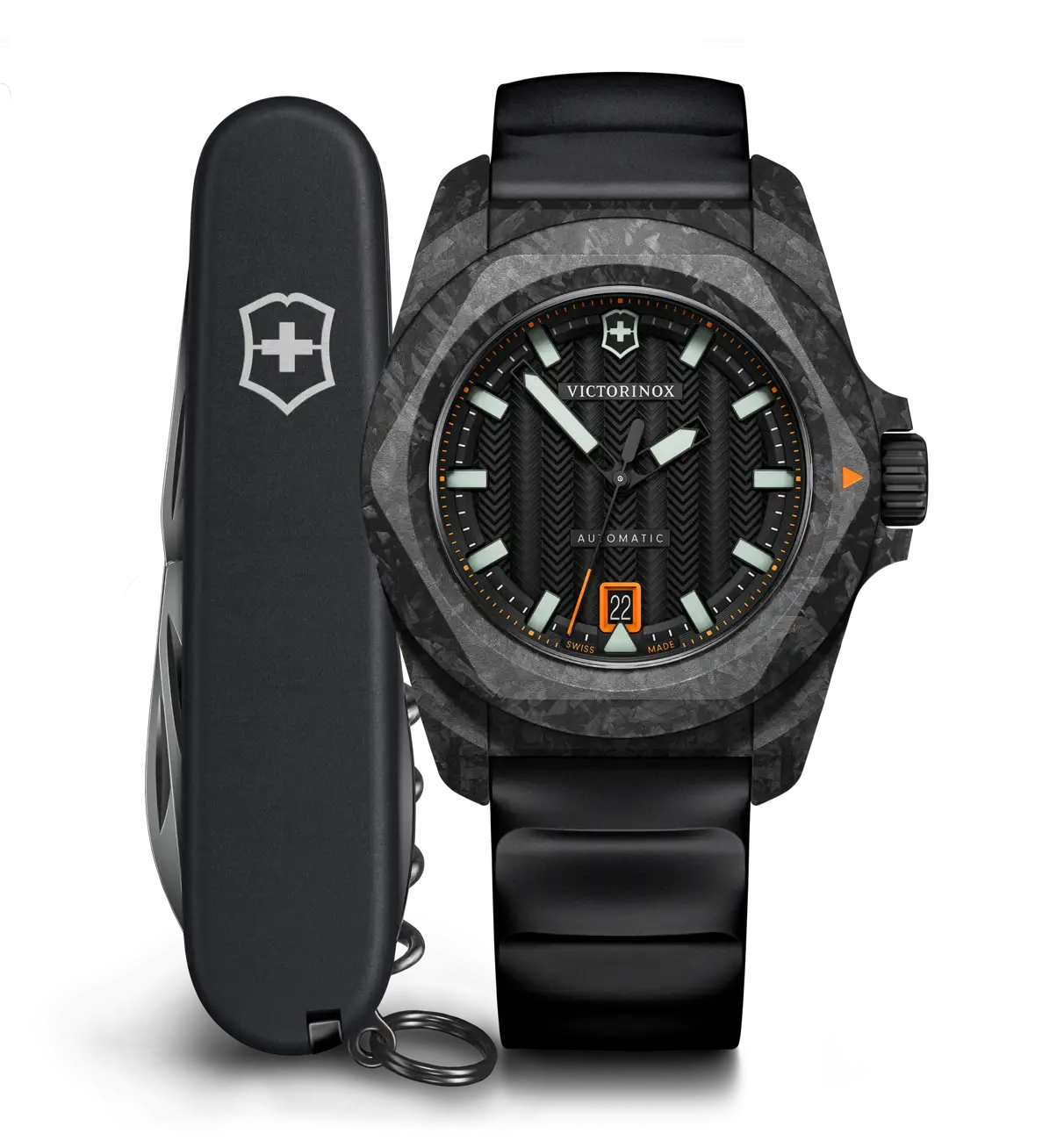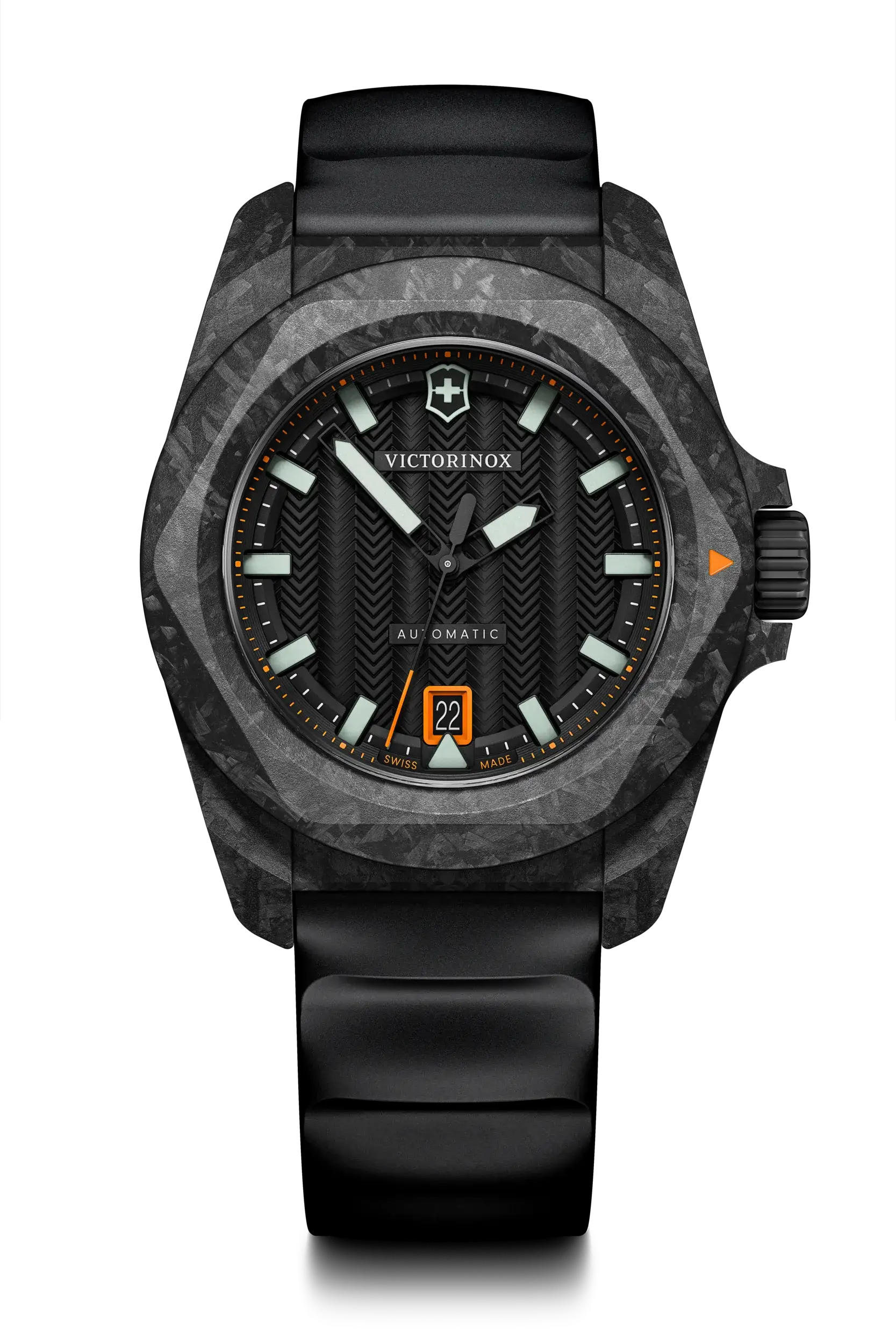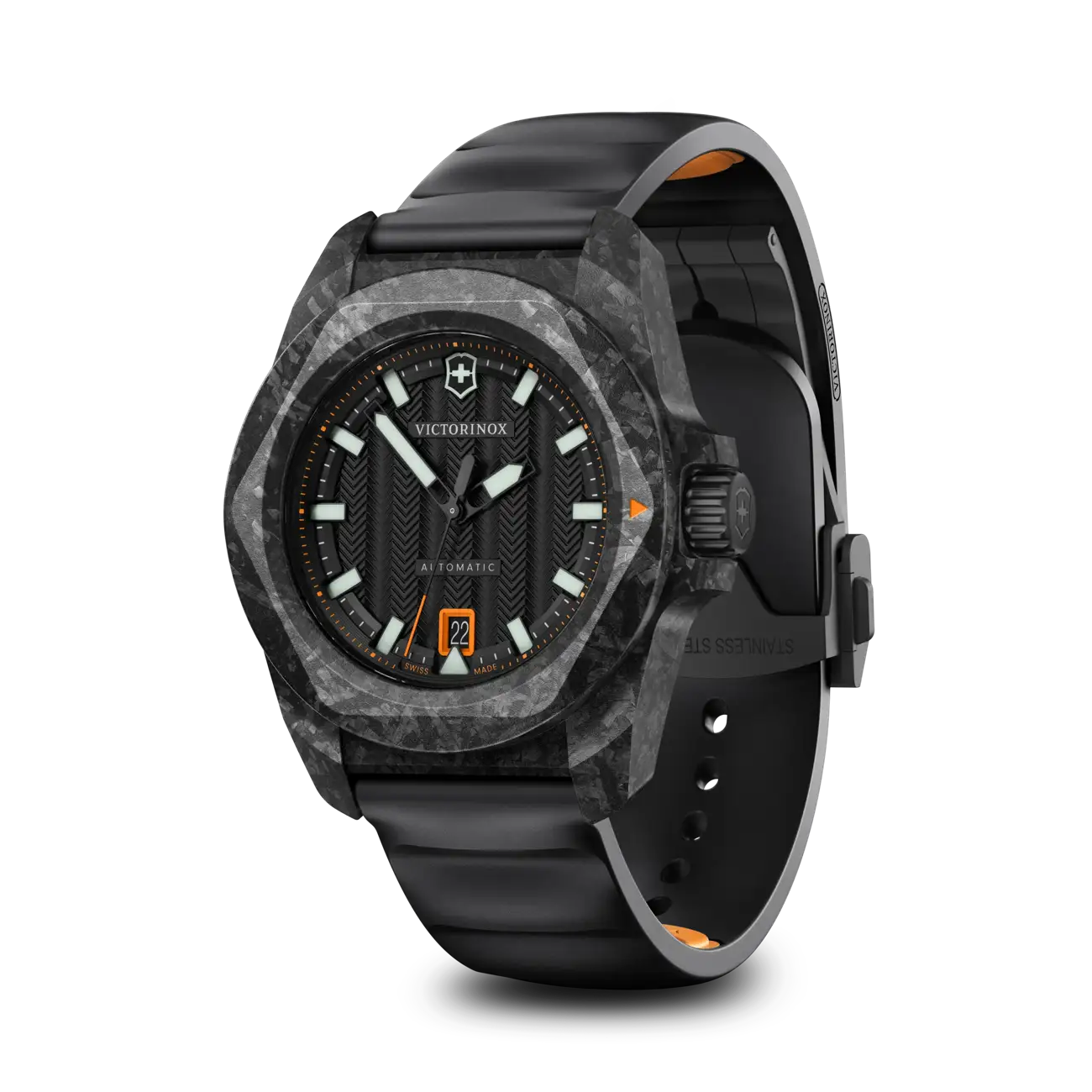 Engineered for resilience and refined for style, the Victorinox I.N.O.X Automatic 41mm men’s watch features a matte black dial framed by a carbon composite case and paired with a durable black rubber strap. Designed to perform under pressure, it boasts ISO-certified shock resistance, 200-meter water resistance, and a scratch-resistant sapphire crystal with triple anti-reflective coating. The automatic movement ensures precise timekeeping without batteries, while luminous hands and markers promise clarity in any light. Crafted in Switzerland, this timepiece includes a matching Victorinox Swiss Army Knife, reflecting its commitment to utility and design. A bold yet versatile choice in luxury watches, it blends rugged engineering with Swiss precision.