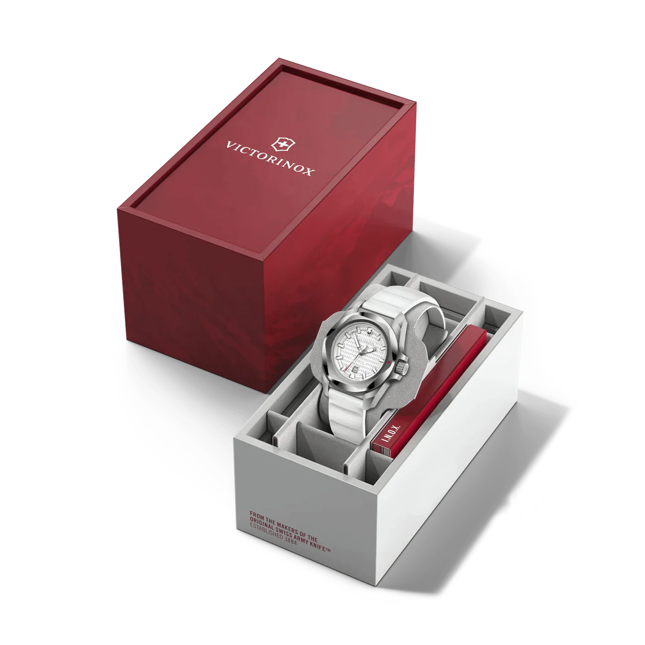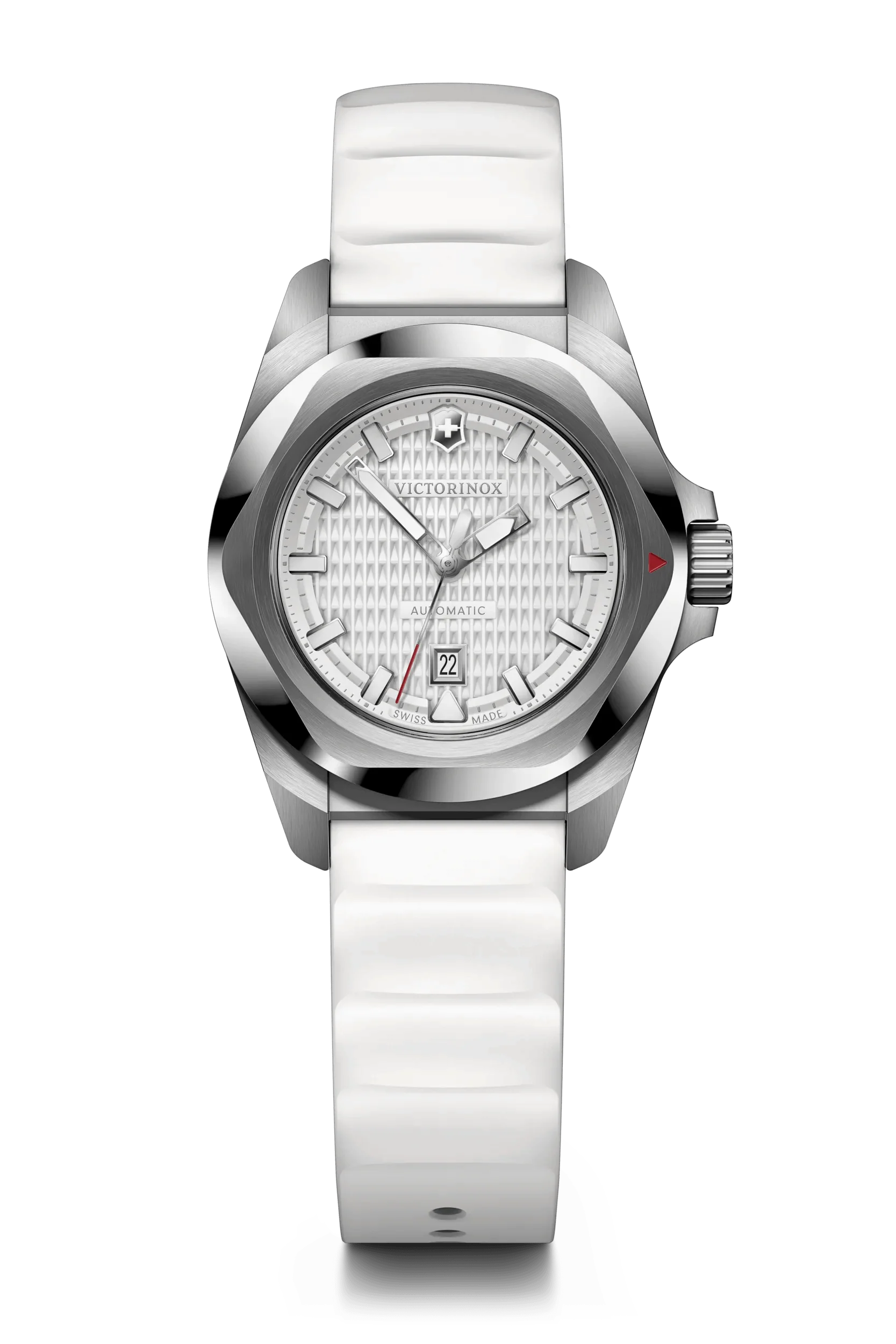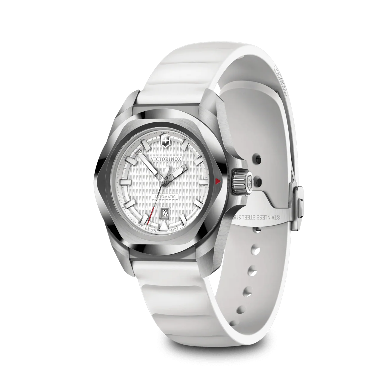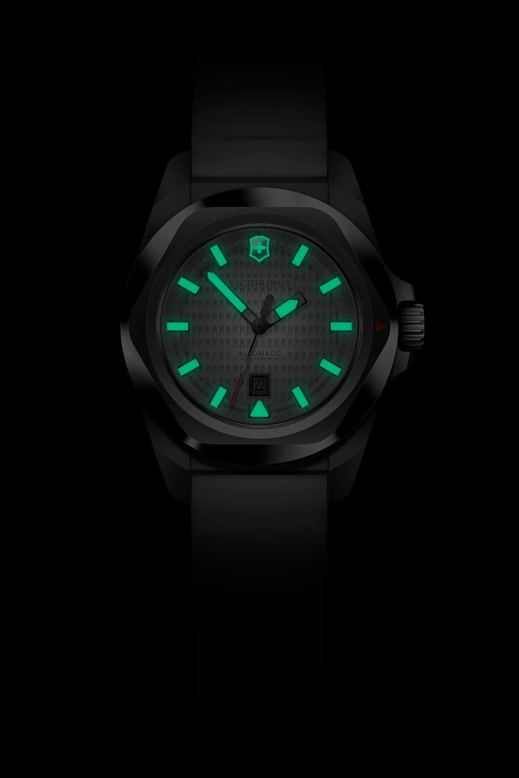 Victorinox I.N.O.X. Small Automatic is a refined women’s watch that blends rugged reliability with elegant design. A 3.2 cm rose-gold tone stainless steel case houses a black guilloché dial with luminescent hands, bold hour markers and a date window at 6 o’clock. The exhibition caseback reveals the Swiss automatic SW100 movement. The watch sits on a black paracord strap, with a lug width of 1.6 cm and a thickness of 1.0 cm, making it comfortable for daily wear. With 100 m water resistance and ISO anti-shock protection, it’s built for all elements and everyday sophistication—a true Victorinox hallmark of quality. Suitable as a women’s watch for both outdoor adventures and urban style.