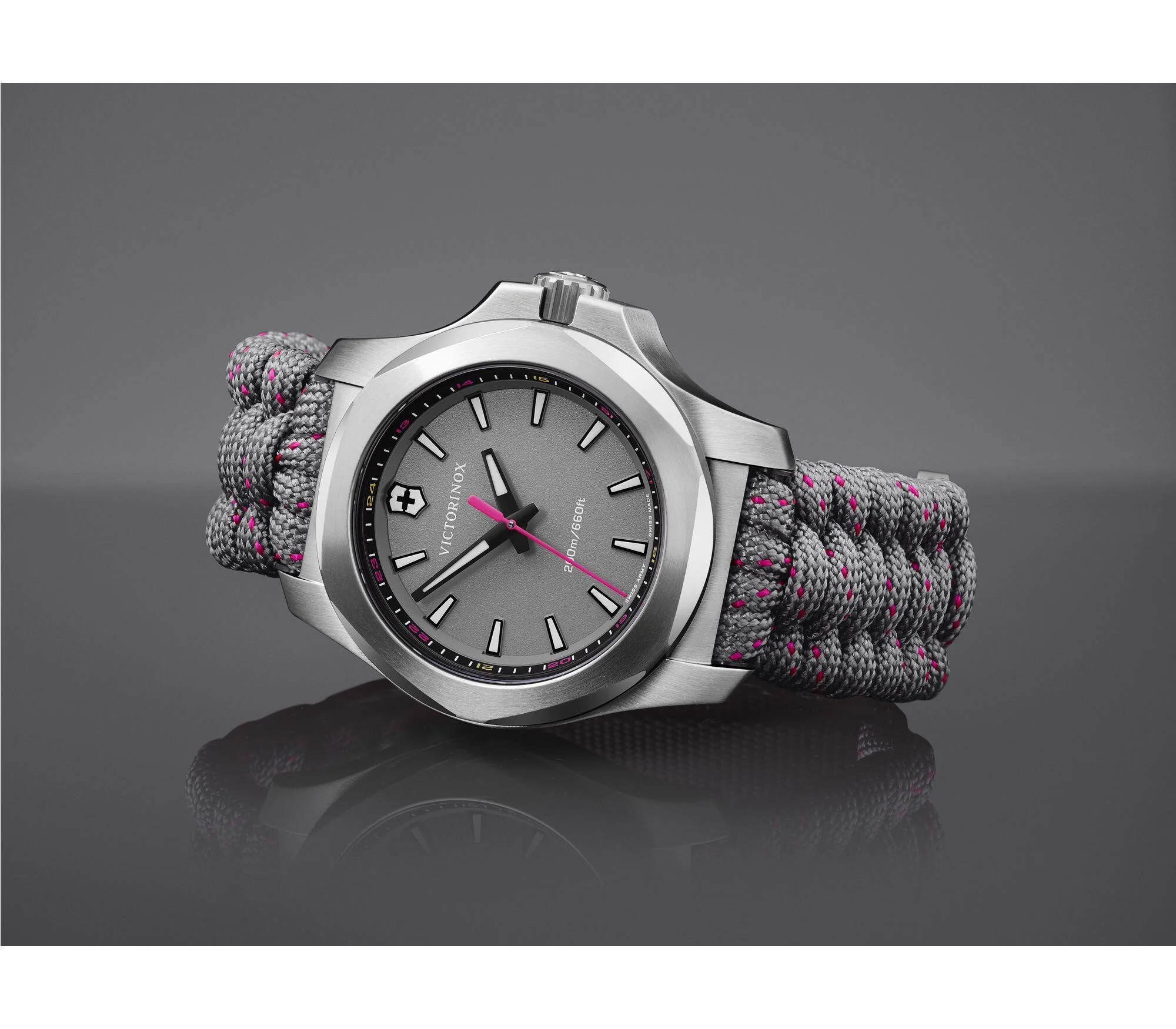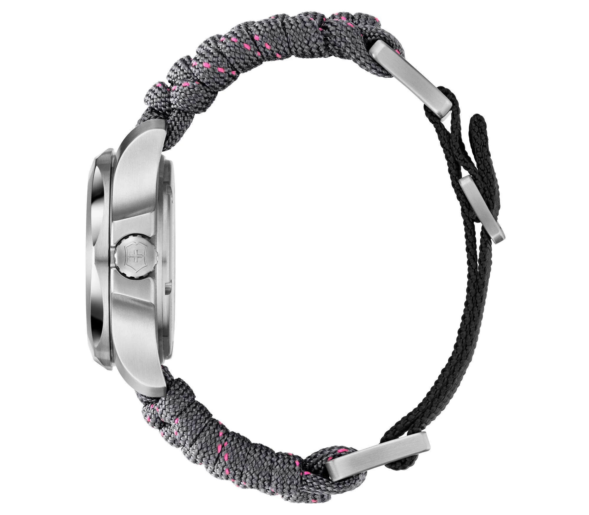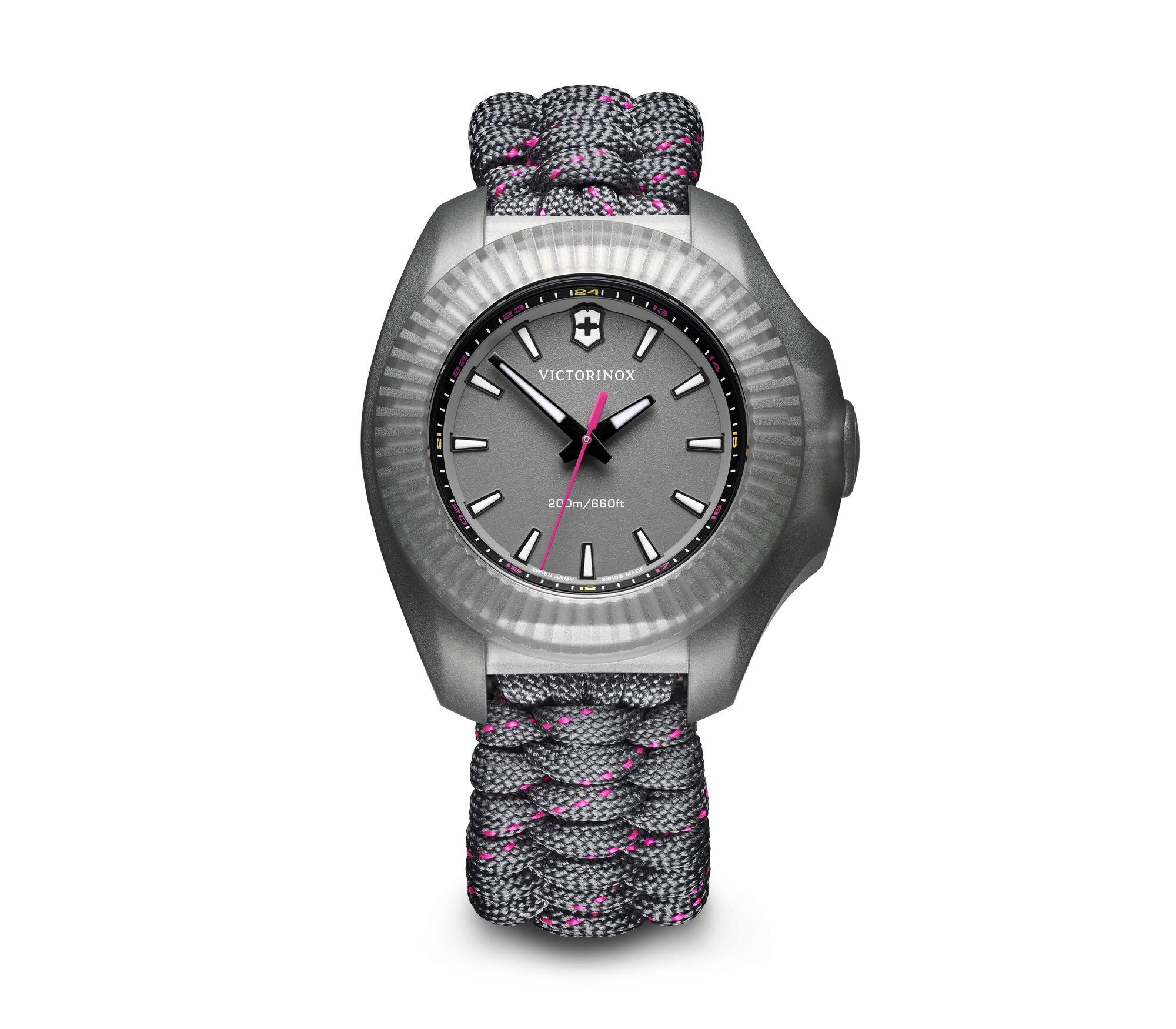 Crafted for resilience and refined with elegance, the Victorinox I.N.O.X. V Women’s Watch 241771 is a modern icon in casual and sport style watches. Featuring a 37mm stainless steel case and a grey sapphire crystal dial, this Swiss-made timepiece is powered by a reliable quartz movement and designed to withstand extreme conditions with 200 meters of water resistance and a scratch-resistant triple-coated crystal. The braided grey textile strap with subtle pink accents adds a contemporary edge, while the removable protective shield allows personalized versatility. Lightweight yet robust, this women’s watch effortlessly blends strength, sophistication, and everyday style with unmatched Swiss craftsmanship.