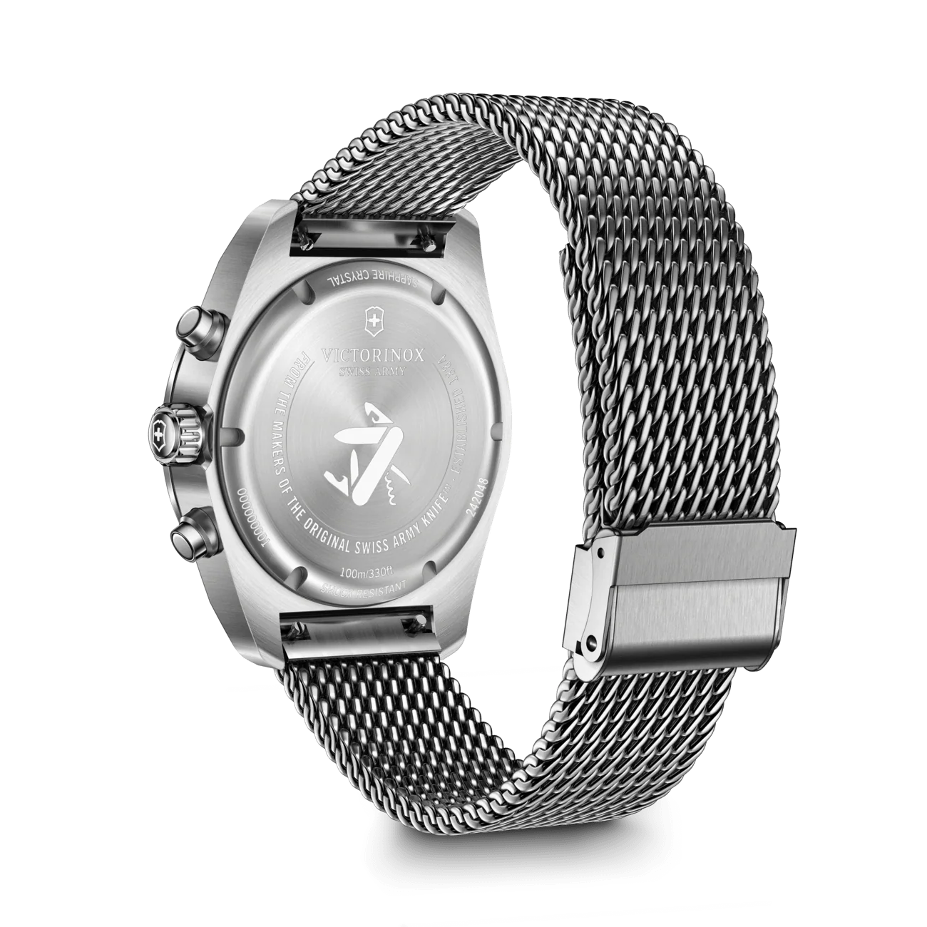 Exceptionally engineered to deliver in any challenging condition; the Swiss Army Chronograph is where resilience and uncompromising accuracy converge. Equipped with Swiss made Ronda 5030.D movement, plus three sub-dials for split timing; it’s a master of precision. The integrated tachymeter on the polished stainless steel bezel expertly tracks distance and time. The adjustable mesh bracelet allows for customizable sizing. Use it to track your progress on gym circuits or record global mileage on flights.