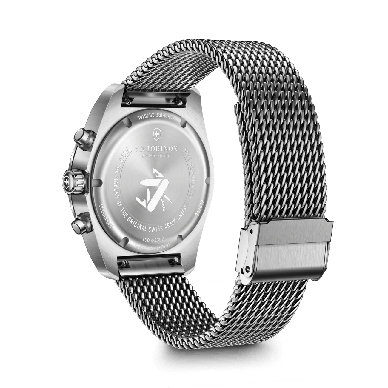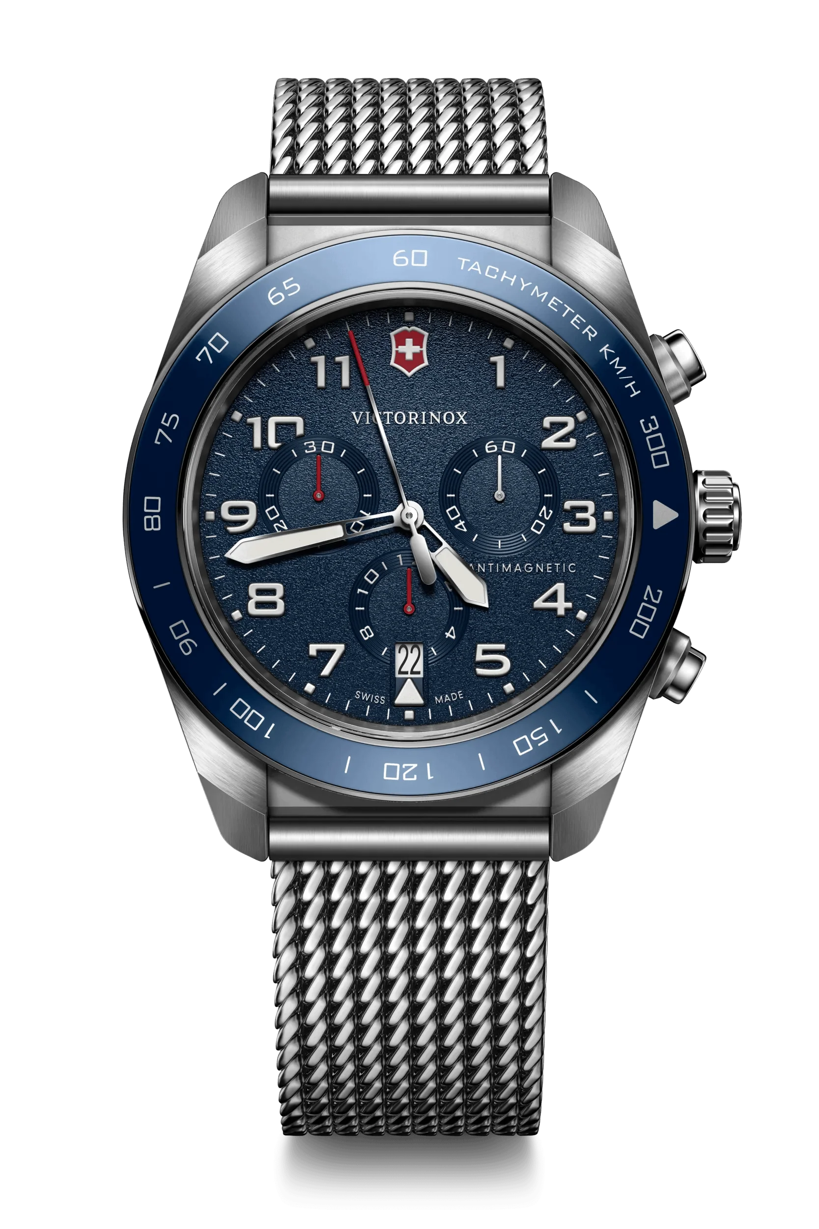 The Victorinox Swiss Army Chrono Blue Dial Mesh Stainless Steel Band Men’s Watch 242049 is a refined blend of precision engineering and contemporary design. Tailored for the modern man, this 42mm luxury watch features a striking blue dial set within a robust stainless steel case, complemented by a sleek silver mesh band. Driven by reliable quartz movement and protected by a scratch-resistant sapphire crystal glass, it delivers dependable timekeeping for athletes, pilots, and professionals alike. With chronograph functionality and 100 meters of water resistance, it effortlessly balances sport-ready features and elevated style. Housed in an official Victorinox box, it’s a sophisticated choice for adults seeking Swiss craftsmanship and timeless appeal.
