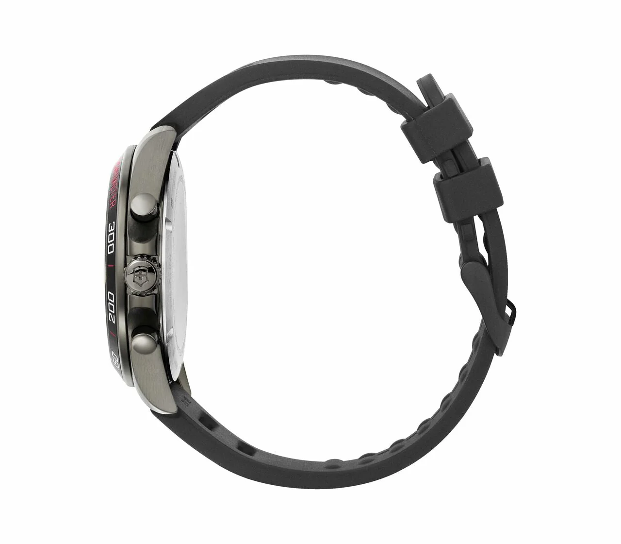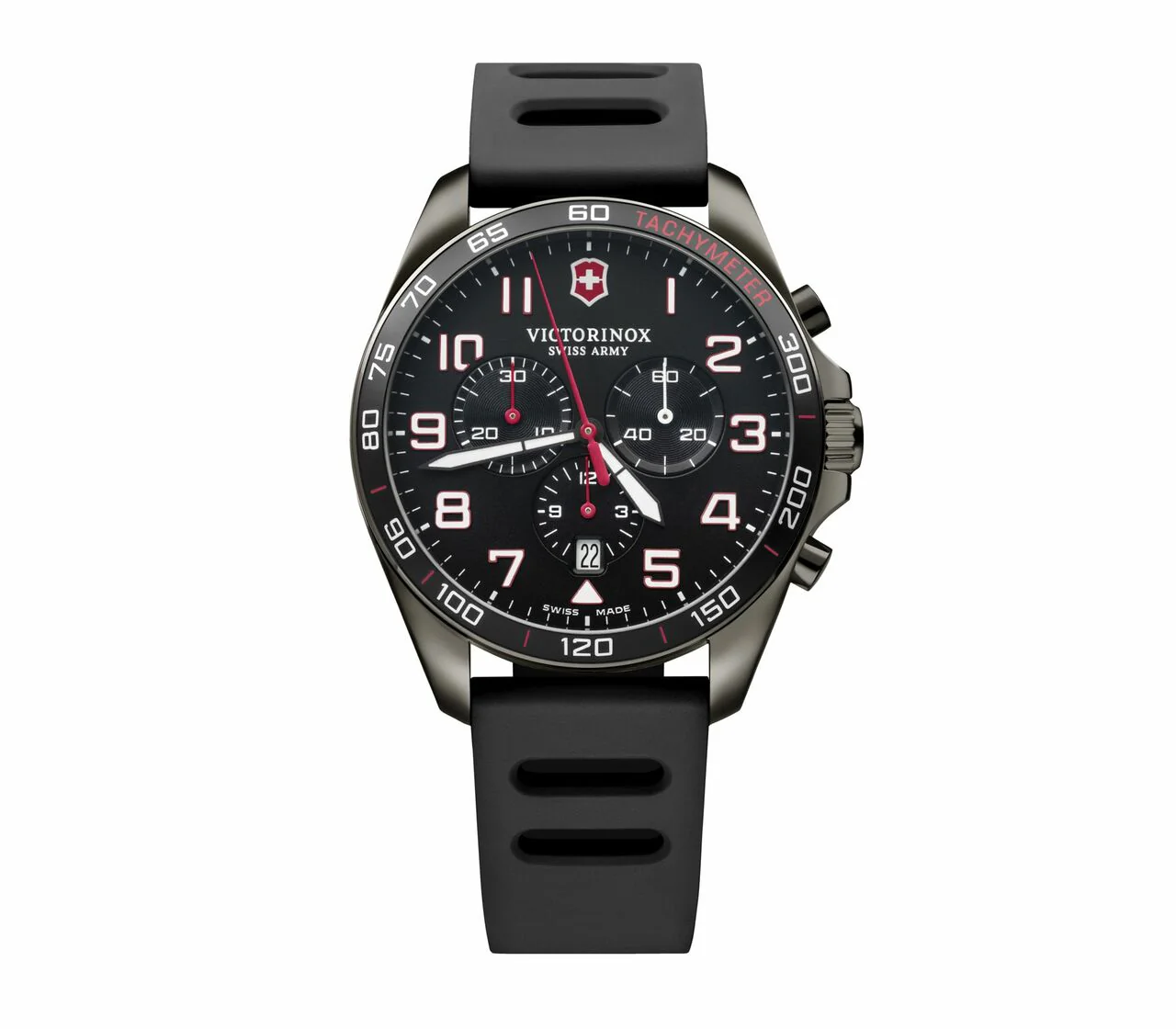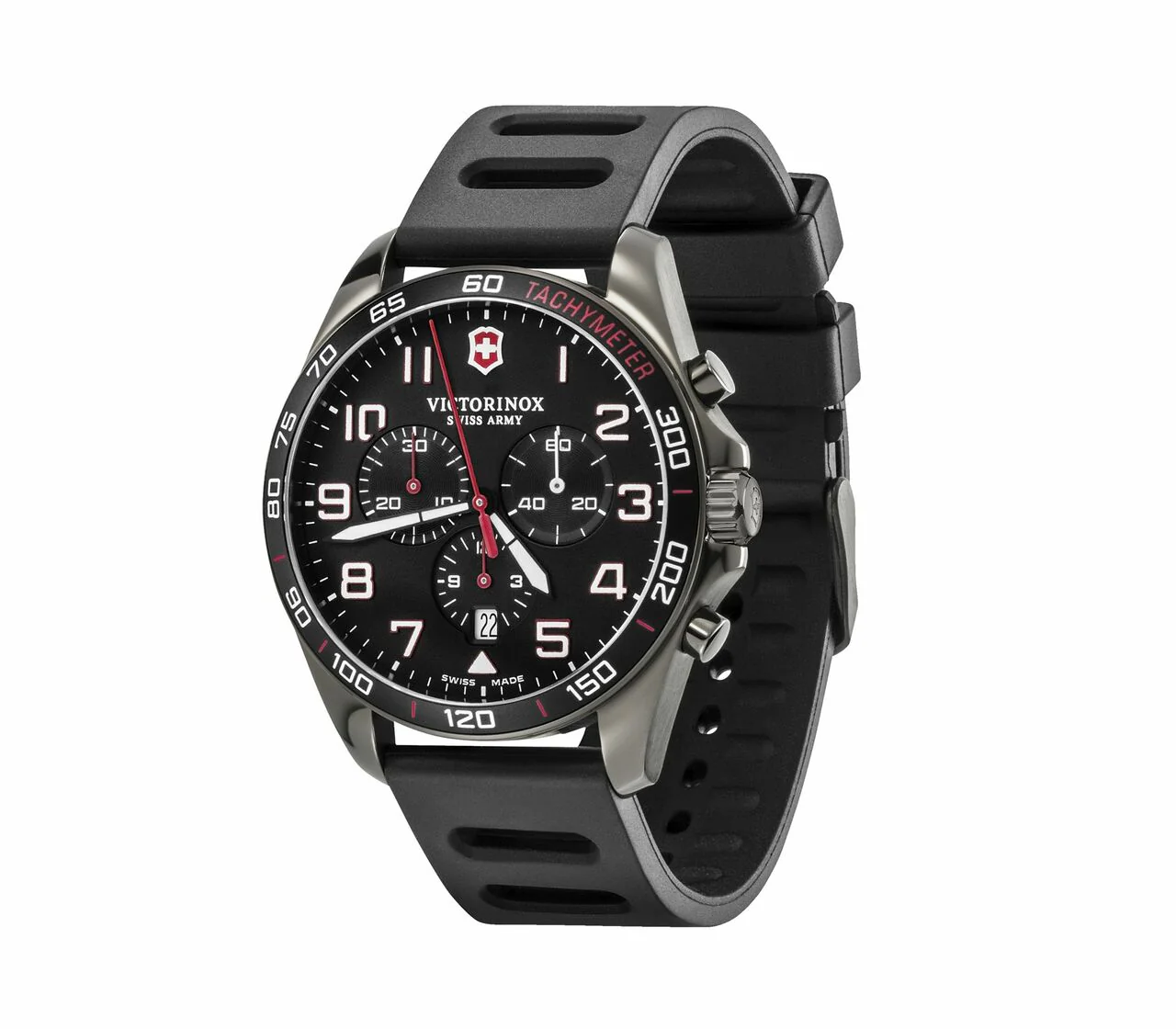 Designed to withstand the elements, the watch features a screw-in caseback and a scratch-resistant, triple-coated anti-reflective sapphire crystal. This ensures durability and clarity, safeguarding your watch face from the rigors of daily wear. Additionally, with a water resistance of up to 10 ATM (100 meters or 330 feet), it is well-equipped to accompany you on underwater adventures or sudden downpours. Whether you are navigating city streets or heading into the wild, the Victorinox Swiss Army Fieldforce Chrono is your perfect companion, combining timeless design with practical functionality.