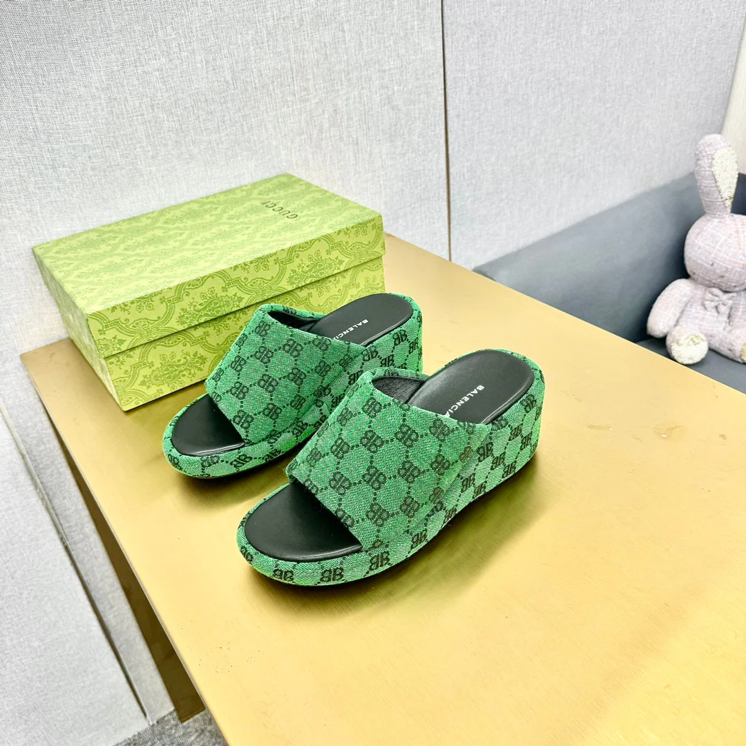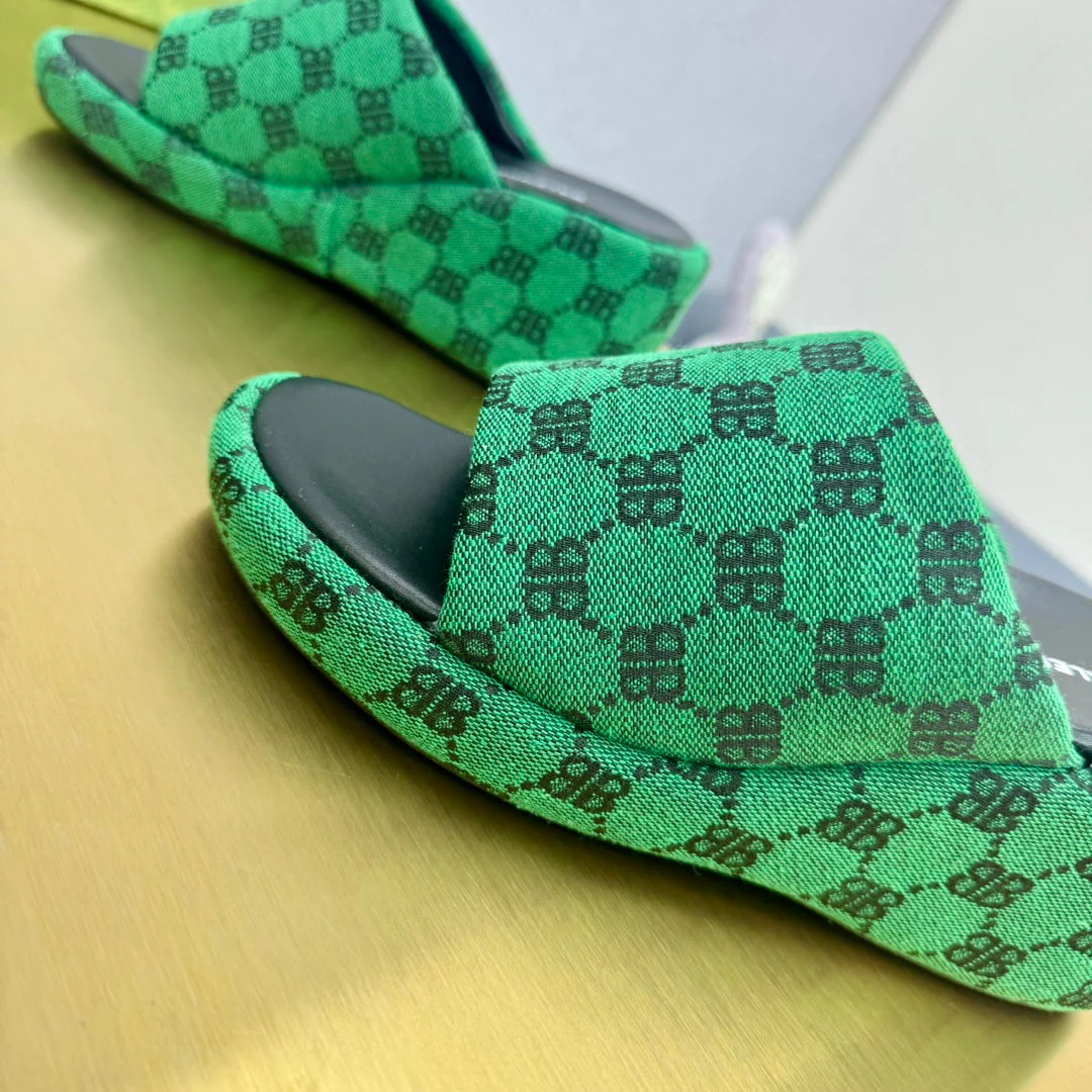 WEDGE SANDALS IN GREEN MONOGRAM JACQUARD FABRIC