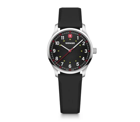 The Wenger City Sport 34mm Black Dial Silicone Watch 01.1421.127 offers a refined balance of Swiss precision and contemporary design. With its sleek 34mm stainless steel case and matte black dial, this women’s watch delivers understated elegance that pairs effortlessly with any outfit. Luminescent hands ensure visibility at a glance, while the polished silver bezel adds a subtle touch of sophistication. The black silicone strap provides a lightweight, comfortable fit for all-day wear, secured with a regular buckle closure.