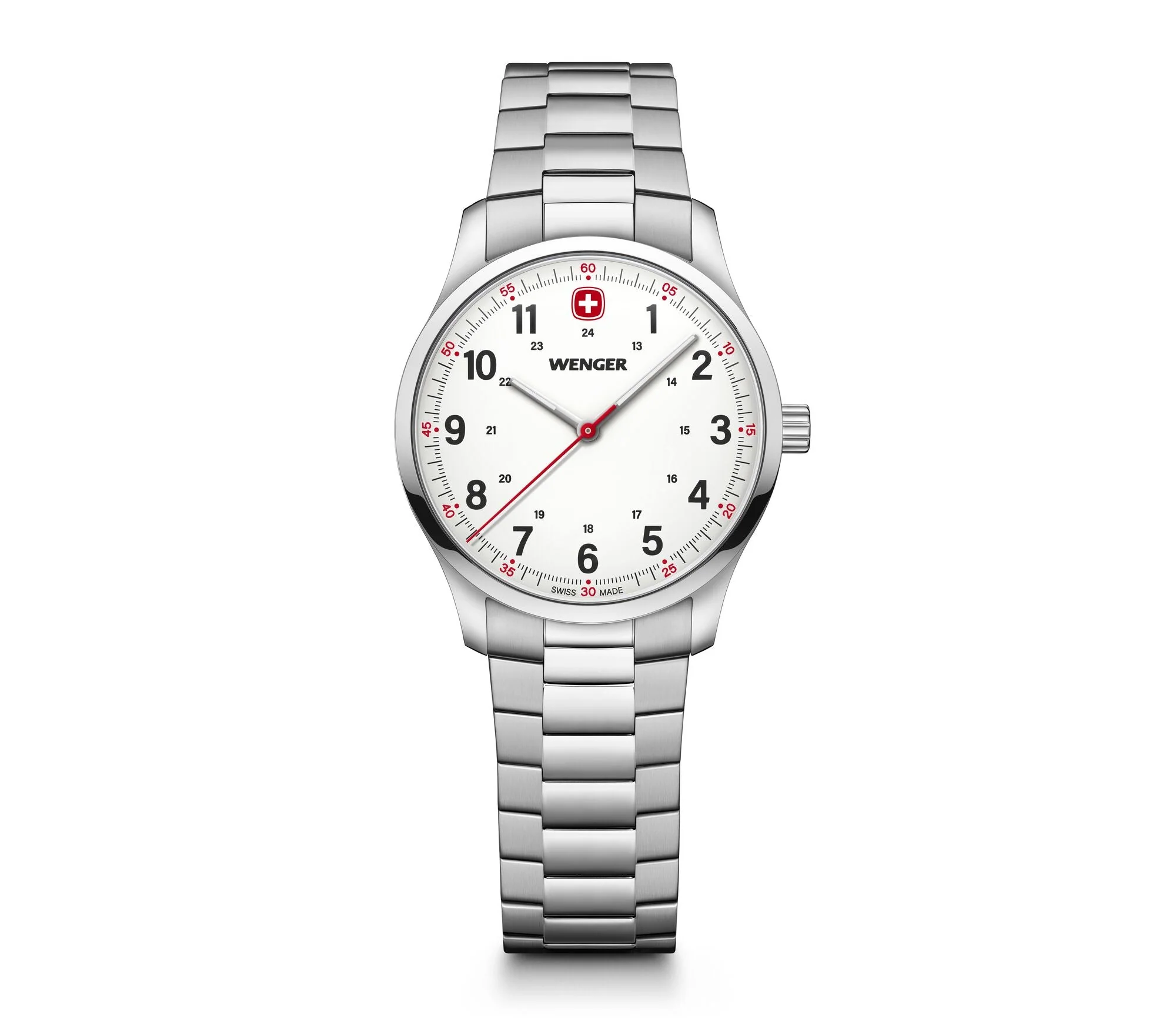 The Wenger City Sport 34mm White Dial Stainless Steel Watch exudes refined simplicity with its polished silver case, matt white dial, and seamlessly integrated stainless steel bracelet. Crafted for the modern woman, this women’s watch blends Swiss precision with understated elegance, featuring luminescent hands for clear readability and a mineral crystal glass that offers both durability and brilliance. The sleek 34mm case, paired with a sliding buckle closure, ensures a tailored fit and lasting comfort, making it ideal for everyday sophistication or formal occasions.
