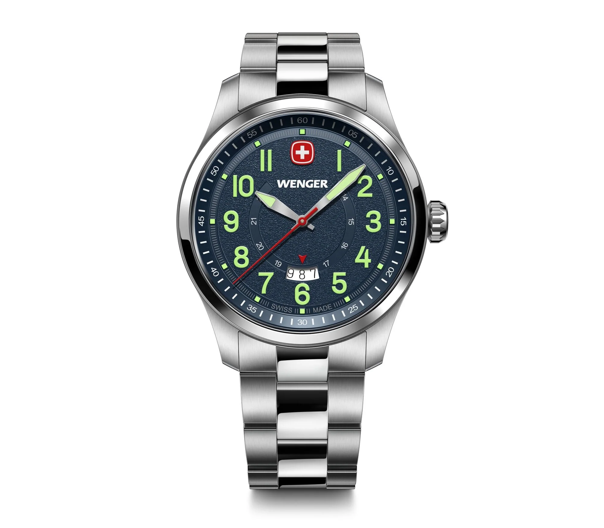 Refined yet bold, the Wenger Terragraph 43 mm Blue Dial Stainless Steel Watch is a masterclass in precision and enduring style. Designed for the discerning man, this men’s watch features a polished stainless steel case and bracelet, paired with a striking semi-matte blue dial that elevates its modern appeal. The luminous hands and date display ensure clarity and functionality, powered by reliable Swiss quartz movement. Water-resistant up to 100 meters and secured with a push-button safety clasp, it combines strength with sophistication. Ideal for professionals and collectors alike, this timepiece stands out in the world of luxury watches with its seamless blend of elegance, performance, and timeless design.