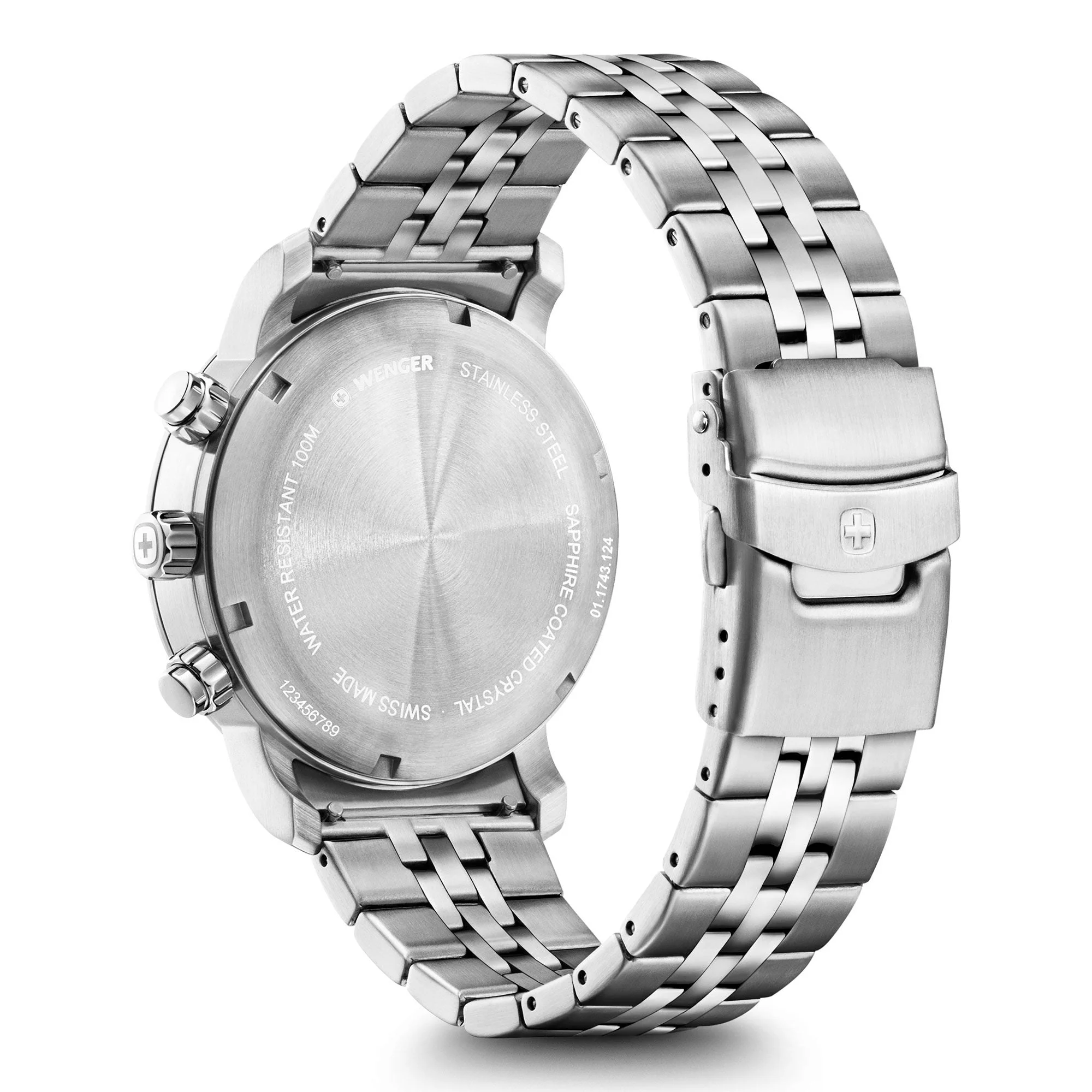 Timeless stainless steel meets modern precision in the Wenger Urban Classic Chrono Blue Dial. The 42 mm round case pairs a polished and brushed finish with a dome-shaped sapphire crystal that amplifies the depth of the deep blue dial. Swiss-made quartz movement ensures reliable accuracy, while the chronograph subdials and a date window at 3 o’clock add practical function without clutter. Dimensions include a 4.2 cm diameter, 1.42 cm thickness, and a 2.2 cm lug width, all mounted on a durable stainless steel bracelet. Water resistant to 100 metres makes it ready for everyday wear and weekend adventures. With a 3-year international warranty, this is a refined men’s watch that wears with ease and distinction.