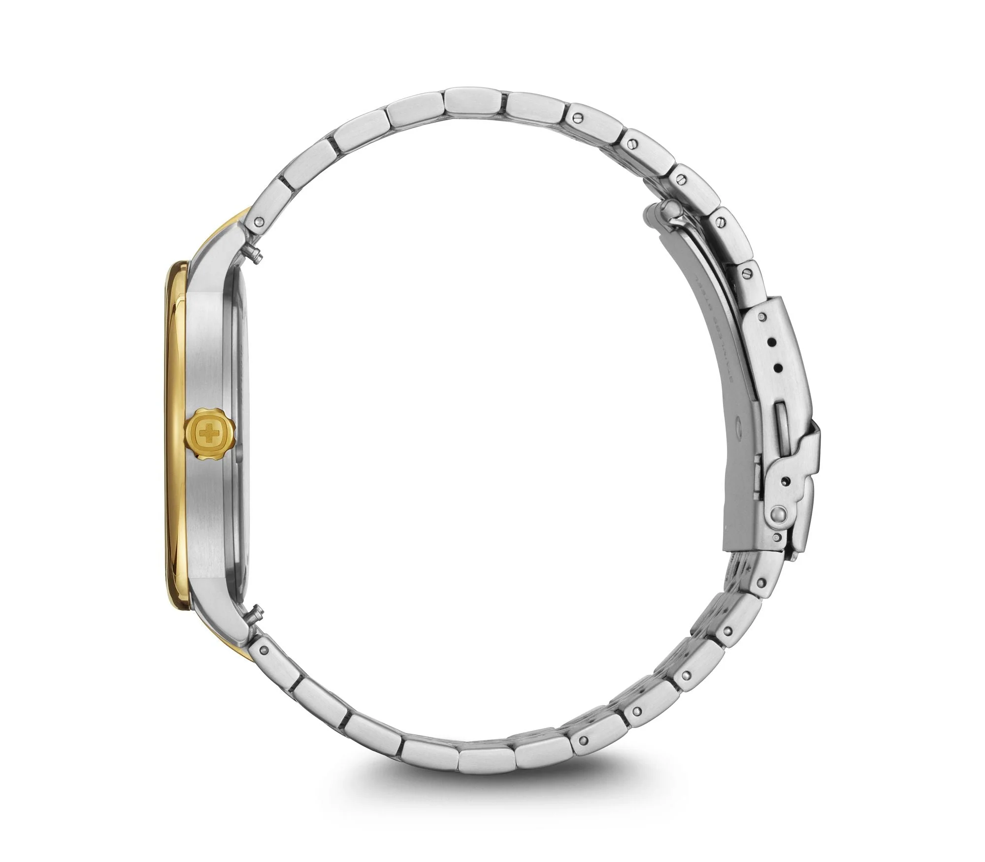 Crafted for the modern gentleman, the Wenger Urban Classic men’s watch blends Swiss precision with relaxed elegance. Featuring a 40mm stainless steel case and a refined two-tone bracelet in silver and gold, it exudes sophisticated simplicity. The crisp white dial is highlighted by green numerals and elongated markers, framed under a sapphire-coated mineral crystal for lasting clarity. Designed for reliability, its analog quartz movement ensures accurate timekeeping, while water resistance up to 100 meters offers durable everyday wear. Lightweight yet substantial at 113.3g, this timepiece captures the essence of casual sophistication in the watches category.