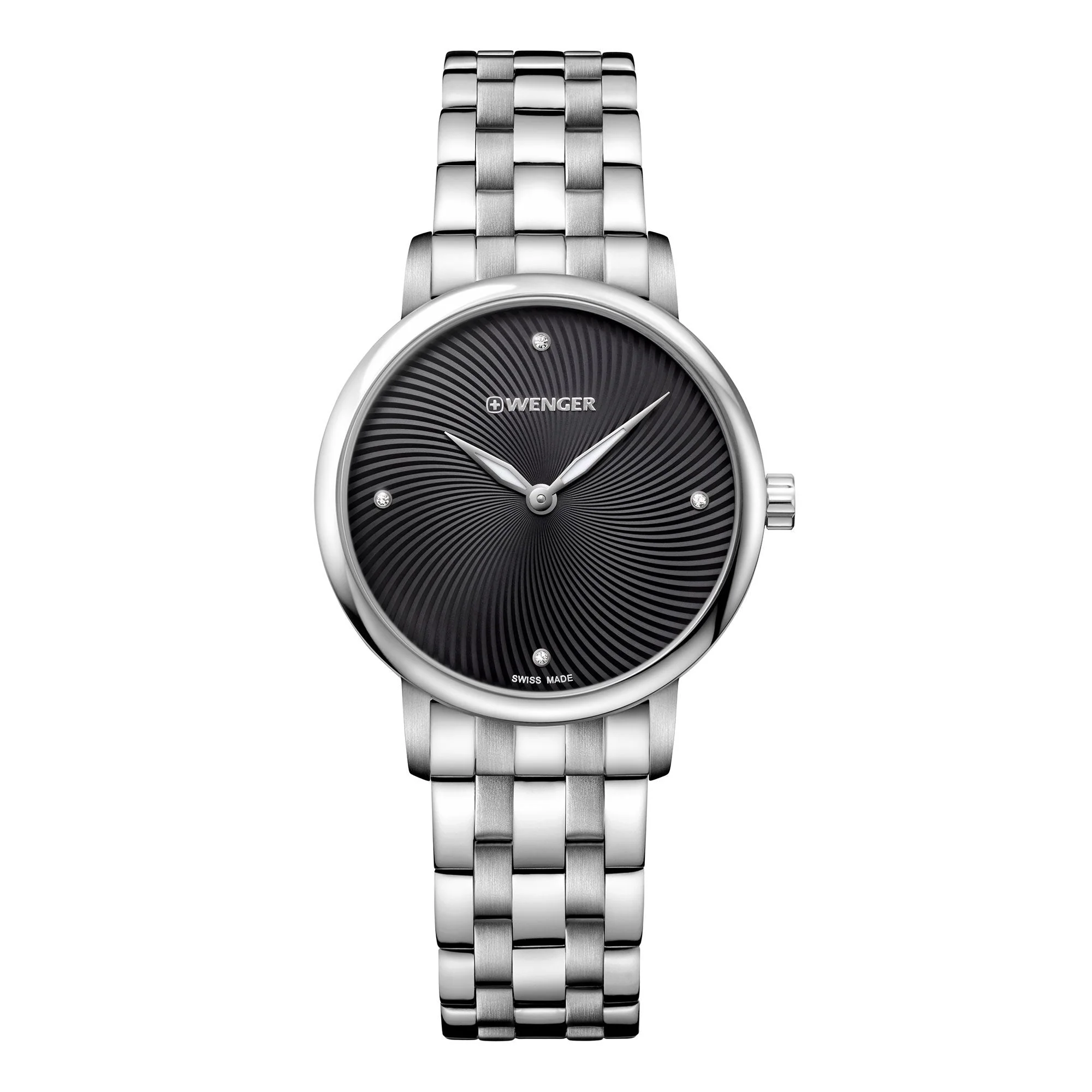 Refined and contemporary, the Wenger Urban Donnissima Black Dial Stainless Steel Watch is a sophisticated women’s watch designed to enhance everyday elegance. Featuring a striking 35mm round stainless steel case with a brushed and polished finish, it frames a unique black guilloche dial adorned with four delicate crystal accents. The luminous leaf-shaped hands ensure readability in low light, adding both function and allure. Crafted with Swiss analog quartz movement and protected by a sapphire-coated mineral crystal, this timepiece guarantees accuracy and durability. With a slim 7.8mm profile and a graceful silver stainless steel bracelet, it offers both comfort and style. Water-resistant up to 100 meters and backed by a 3-year international warranty, it blends performance with timeless charm—perfect for casual style and everyday sophistication in the world of women’s watches.