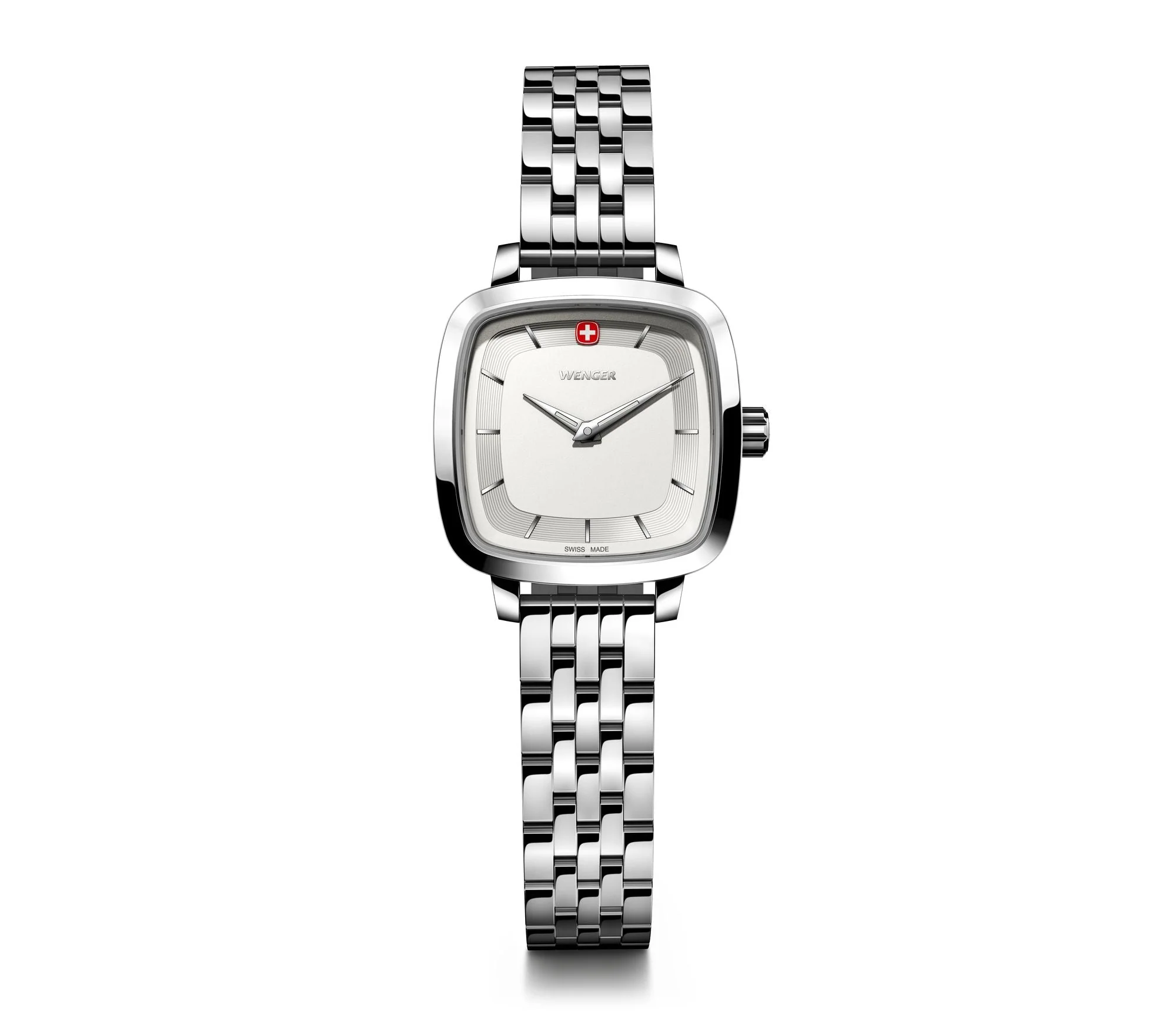 Refined and timeless, the Wenger Vintage Classic 27mm White Dial Stainless Steel Watch 01.1911.101 effortlessly blends minimalist elegance with durable Swiss engineering. Designed for the modern woman, this women’s watch showcases a radiant sandblasted white dial encased in polished stainless steel, complemented by a sleek silver bracelet and bezel. The compact 27mm case offers a graceful fit, while luminescent hands ensure readability in any light. Crafted with a pressed-in stainless steel caseback and mineral crystal glass, it offers water resistance up to 50 meters for everyday confidence. Powered by reliable quartz movement and finished with a sliding buckle closure, this watch is as functional as it is stylish—a sophisticated statement piece that reflects authentic Swiss craftsmanship and enduring style.