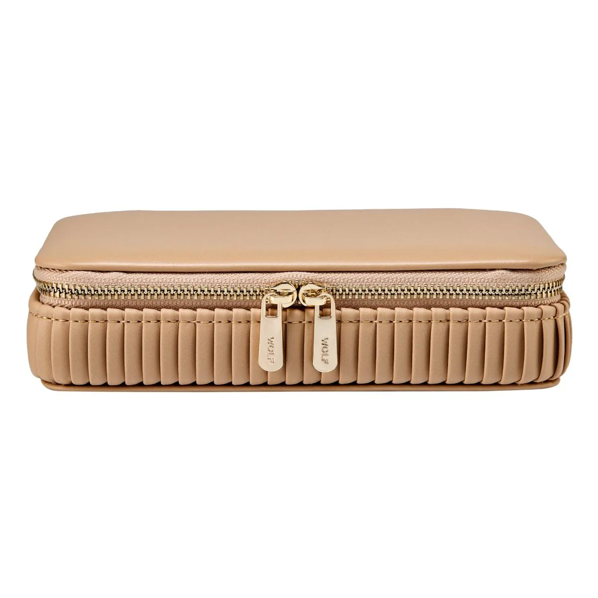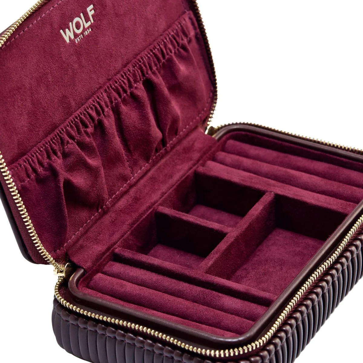 Refined and travel-ready, the Wolf Bella Travel Zip Case in smooth vegan leather with pleated sides and gold-tone hardware exudes quiet luxury. Inside, three LusterLoc™ lined compartments guard against tarnish while two ring rolls cradle rings or small earrings. The lid offers two elasticated pockets for extra storage, and the external box measures 16.5 cm long, 10.2 cm wide and 4.4 cm high, compact for travel yet generous for daily organisation of a men’s watch or women’s watch and other treasured pieces. Crafted by Wolf, it blends craftsmanship, design and secure portability for on-the-go storage as part of premium travel case design.