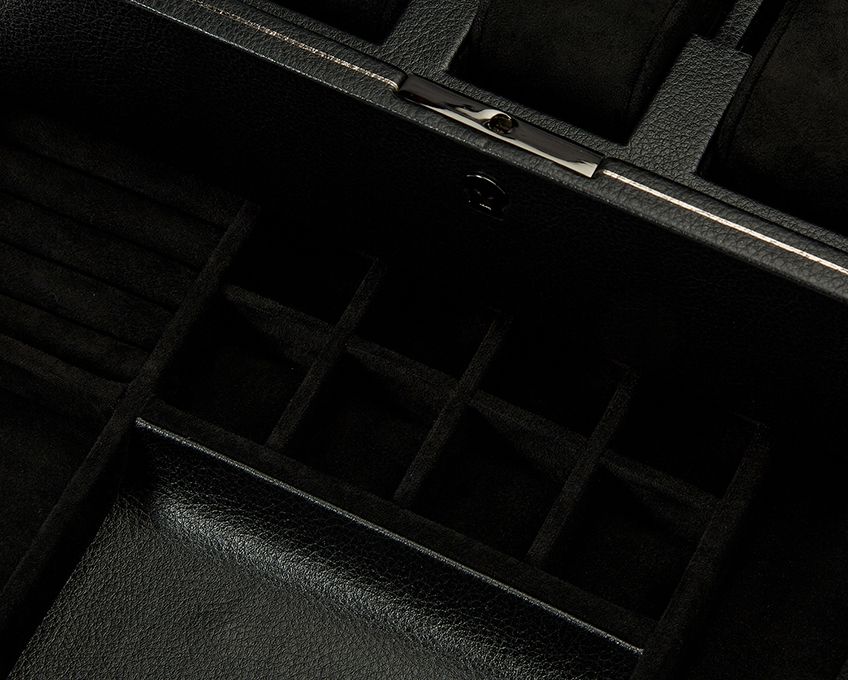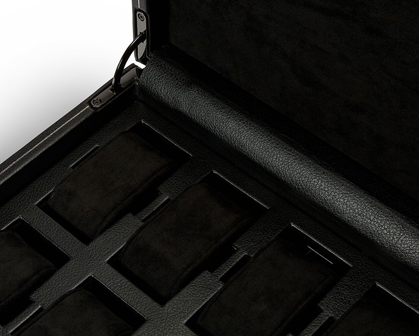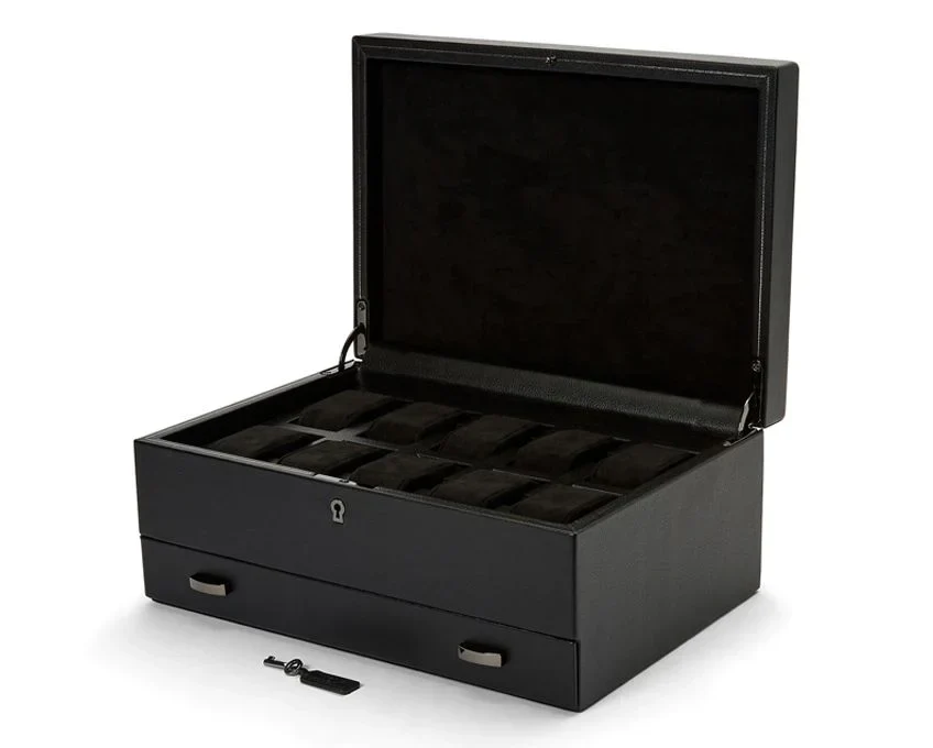 Crafted by Wolf, the British Racing 10 Piece Watch Box with Storage 792802 fuses heritage with modern precision. Wrapped in pebble-grain vegan leather in deep British racing green, it features a quad-angled paneled lid with hand-pressed gold foil lines, a fluted bezel and refined gold hardware. Inside, suspended watch cushions cradle each piece, while cushion-close hinges ensure quiet, secure closure. A lock and key protect up to 10 watches, with a dedicated smart watch USB port for convenience. Measuring 33 cm long, 23 cm wide and 16 cm high, this elegant organiser balances compact presence with generous storage for both men’s and women’s watches.