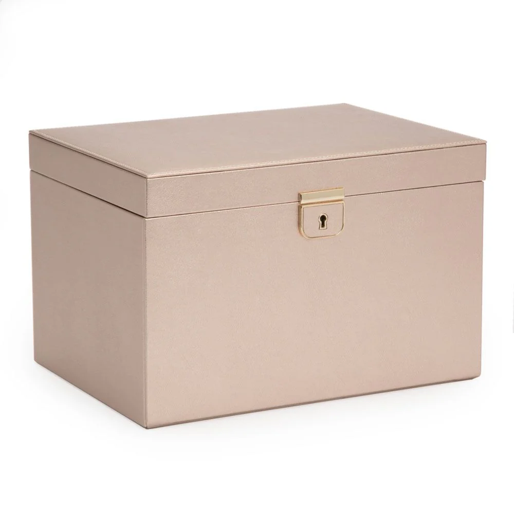 Refined elegance meets practical artistry in the Wolf Palermo Large Jewelry Box Rose Gold. Crafted in rose-gold leather with polished gold recessed locks, this jewellery box embodies timeless sophistication. Inspired by its Italian namesake, the Palermo blends beauty with organisation and security. Inside, a spacious, segmented interior holds rings, bracelets, necklaces and watches. Inside, LusterLoc anti-tarnish lining protects cherished pieces and helps prevent tarnish for years. Outer dimensions are approximately 29.2 cm long, 22.2 cm wide and 19.1 cm high, with three ring rolls, fifteen compartments and two watch slots. A gold-tone lock and key ensure peace of mind, making it ideal for housing a men’s watch or a women’s watch, for a curated collection.