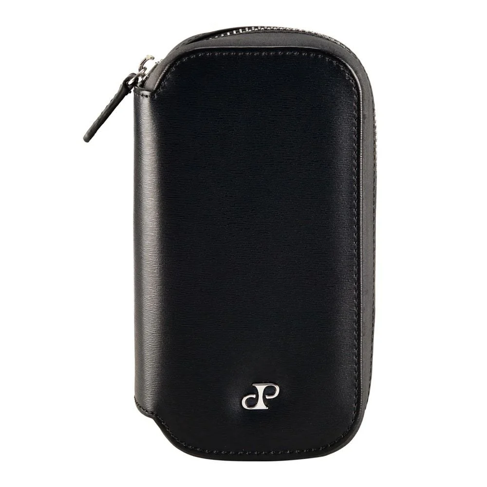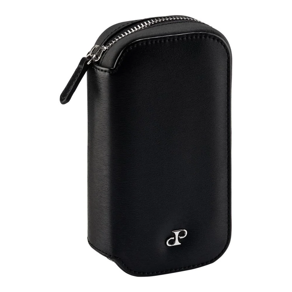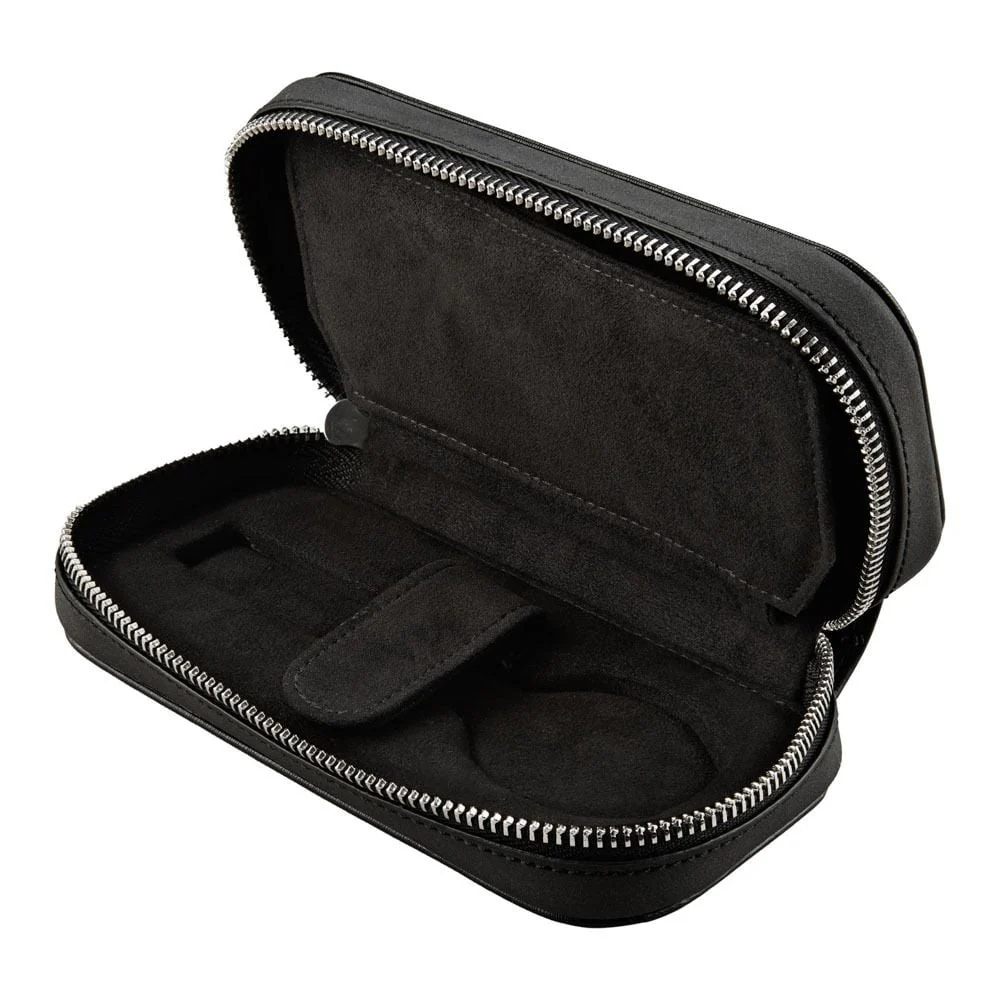 Designed for the discerning traveller, the Wolf Philipp 2 Piece Watch Zip Case in black blends refined form with practical protection for two timepieces on the go. Crafted in black grained vegan leather with a black Ultrasuede lining, it cradles two padded watches beneath a secure zip closure. Silver finish hardware and the DP logo reflect Wolf’s premium craftsmanship. Measuring 9.45 cm L x 4.0 cm W x 17.5 cm H, this compact, stocky case slips easily into luggage or a carry-on, making it ideal for both men’s watch and women’s watch needs. A sophisticated companion for travel and everyday elegance.