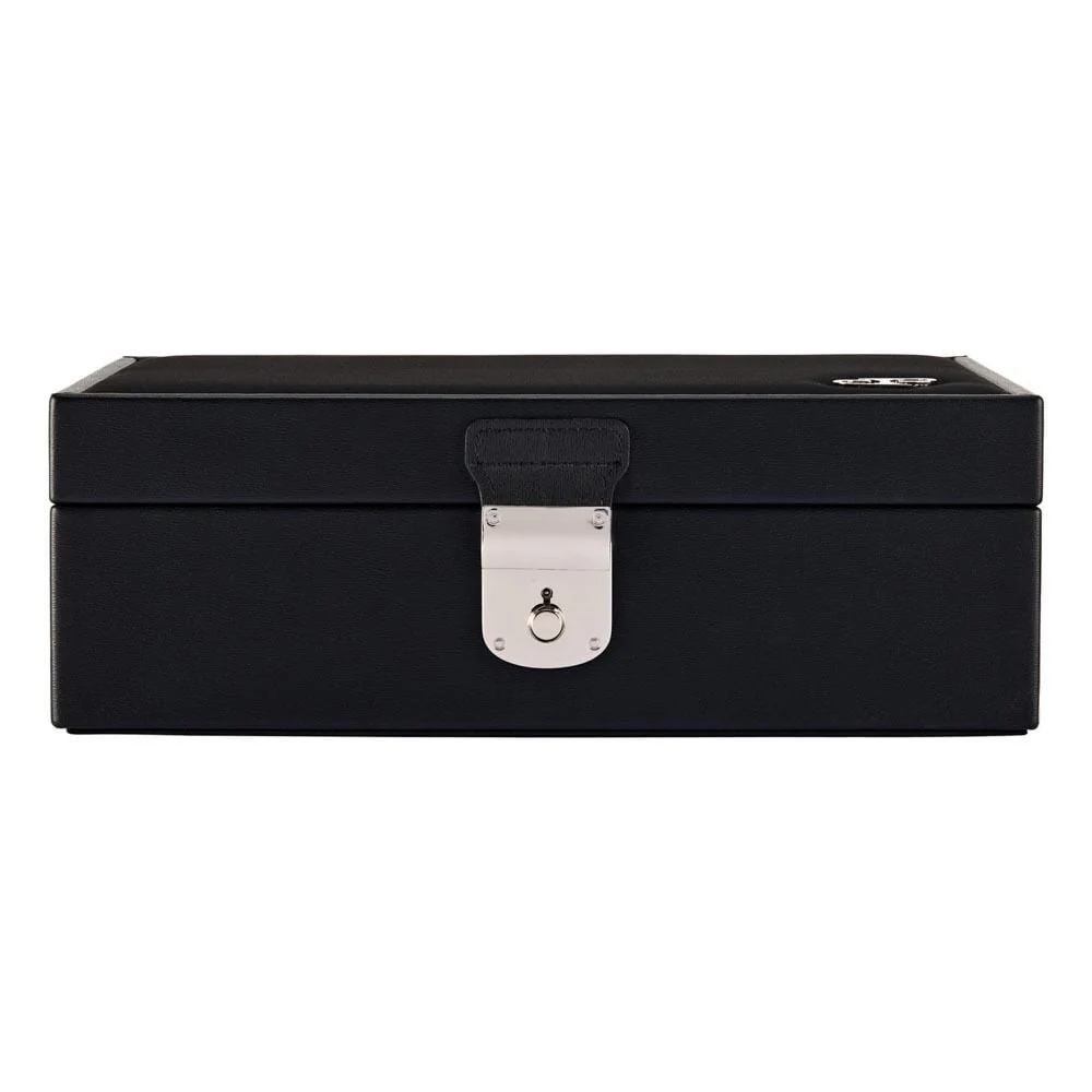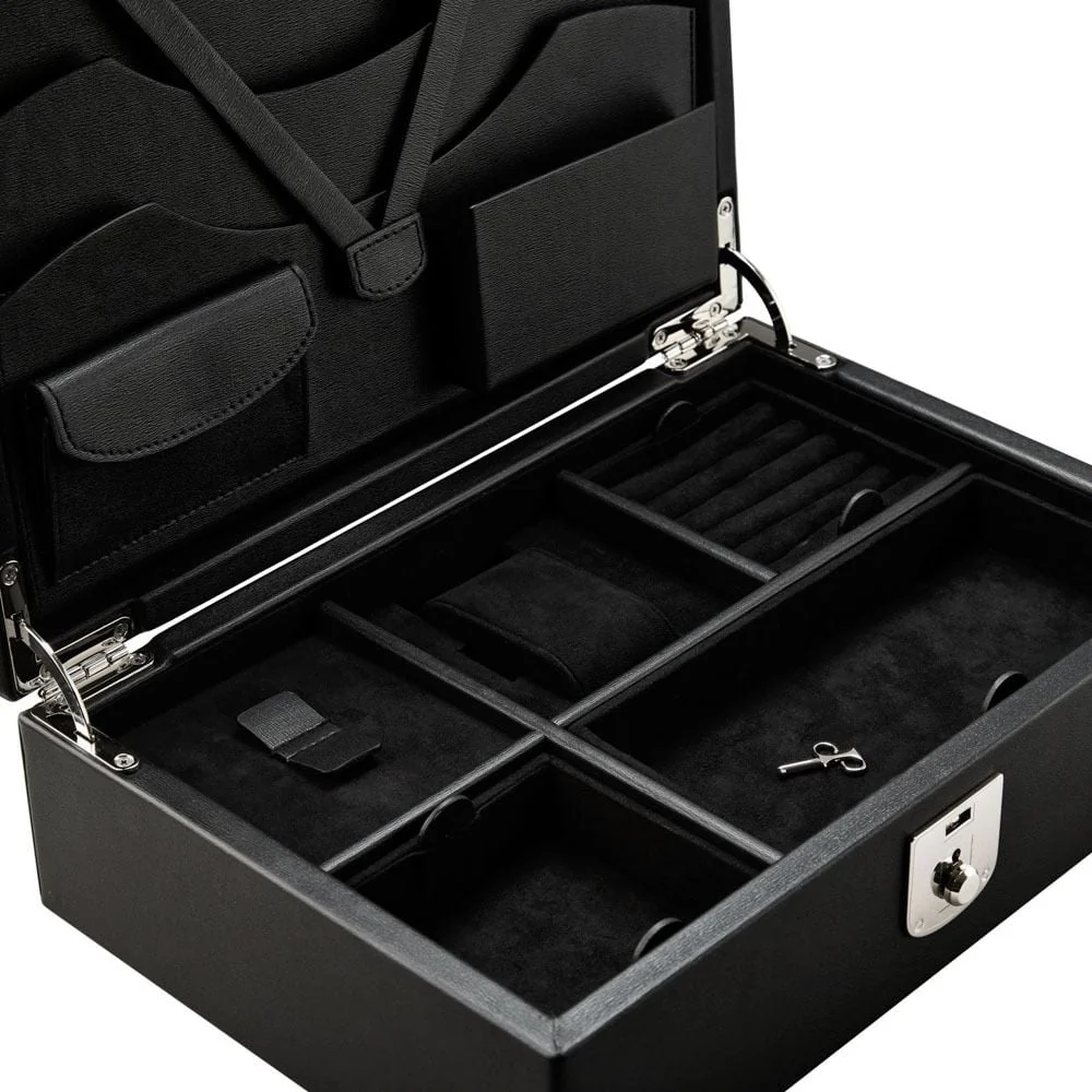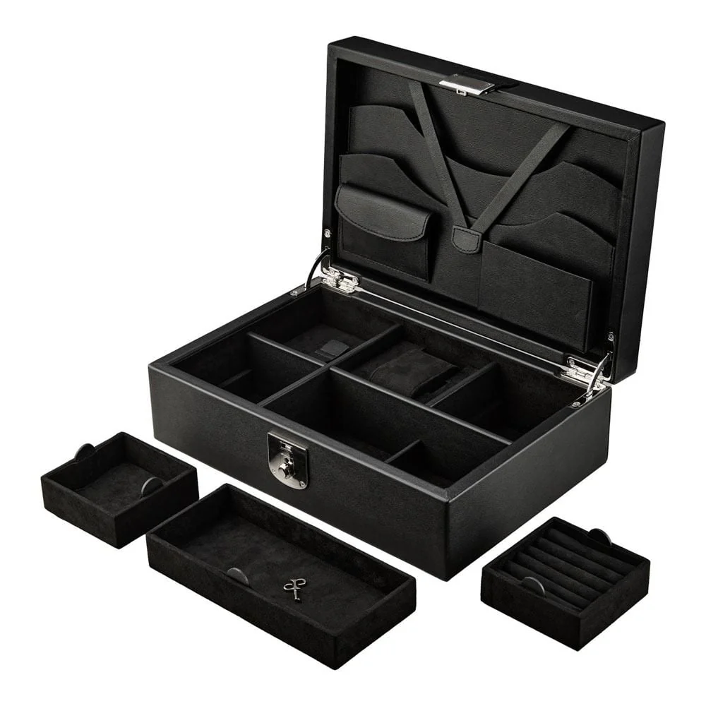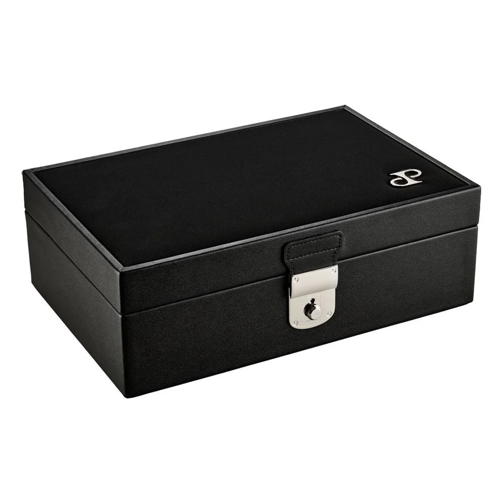 Wolf presents the Philipp Watch and Jewelry Lifestyle Box, a refined home for watches and jewellery that blends vintage charm with modern sophistication. Crafted in black grained vegan leather with a black nubuck exterior, it exudes quiet elegance. The Ultrasuede lining with LusterLoc™ guards precious pieces against tarnish for up to 35 years. Dimensions are 30.48 cm long, 20.32 cm wide and 10.16 cm high, with a suspended watch cushion, removable ring slots, three jewellery sections and a pen tray, plus concertina stationery storage and a lid pocket with a credit card slot (case not included). Silver finish hardware and the DP logo provide a subtle designer touch, ideal for a men’s watch or women’s watch collection.
