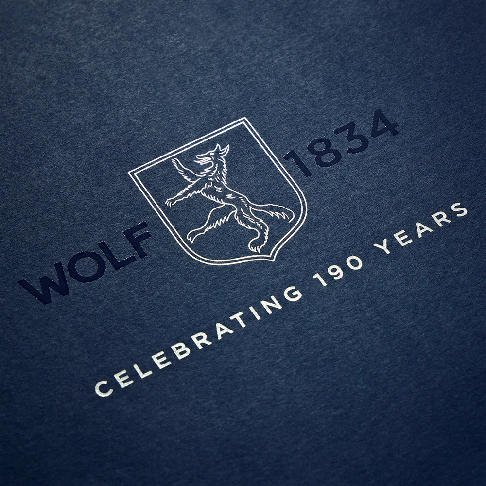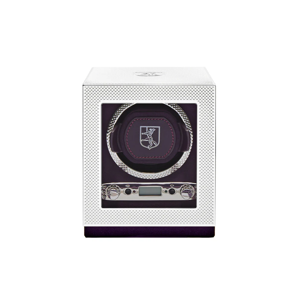 Wolf Silver Programmable Single Watch Winder 190003 merges refined engineering with timeless design. Encased in 999 pure silver plating, it features an engine-turned exterior and the 190th anniversary crest atop a piano-hinged door, opening to a deep blue Ultrasuede interior. The programmable winding offers 300 to 1,200 turns per day, with clockwise, anti-clockwise and bi-directional options and a smart return-to-start function. Compact at 13.3 cm L x 17.5 cm W x 15.9 cm H, it can run on AC power (universal adapter included) or D-Cell/Lithium batteries, and includes a silver cleaning cloth. A premium watch winder for men’s watches and women’s watches, presented in 190th anniversary packaging to celebrate Wolf’s legacy.