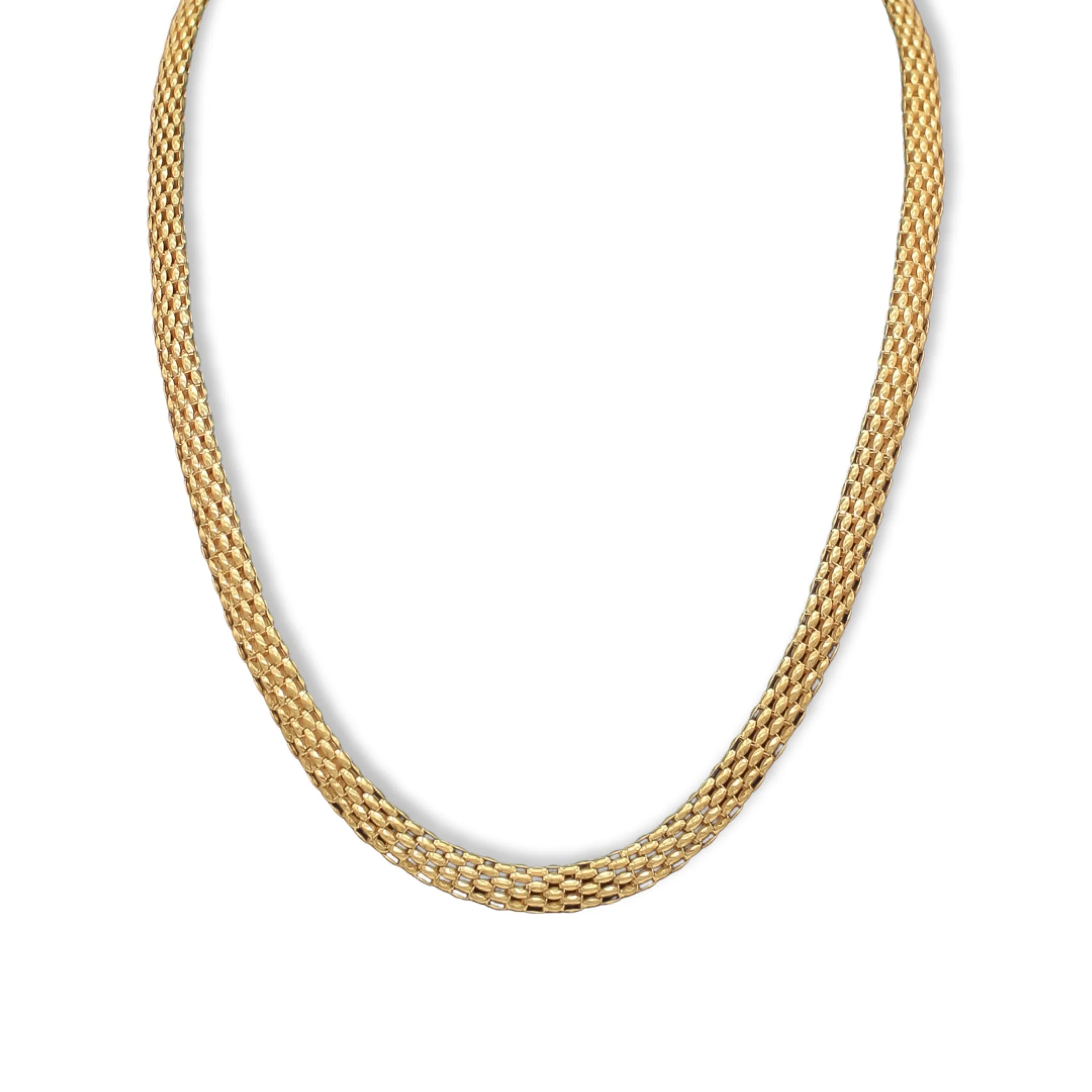 18K Yellow Gold Fancy Italian Mesh Necklace. 14.2g, 16″ length; luxurious mesh design. Crafted with sophistication and elegance. Unique, refined piece. A luxurious statement piece. Indulge and treasure.