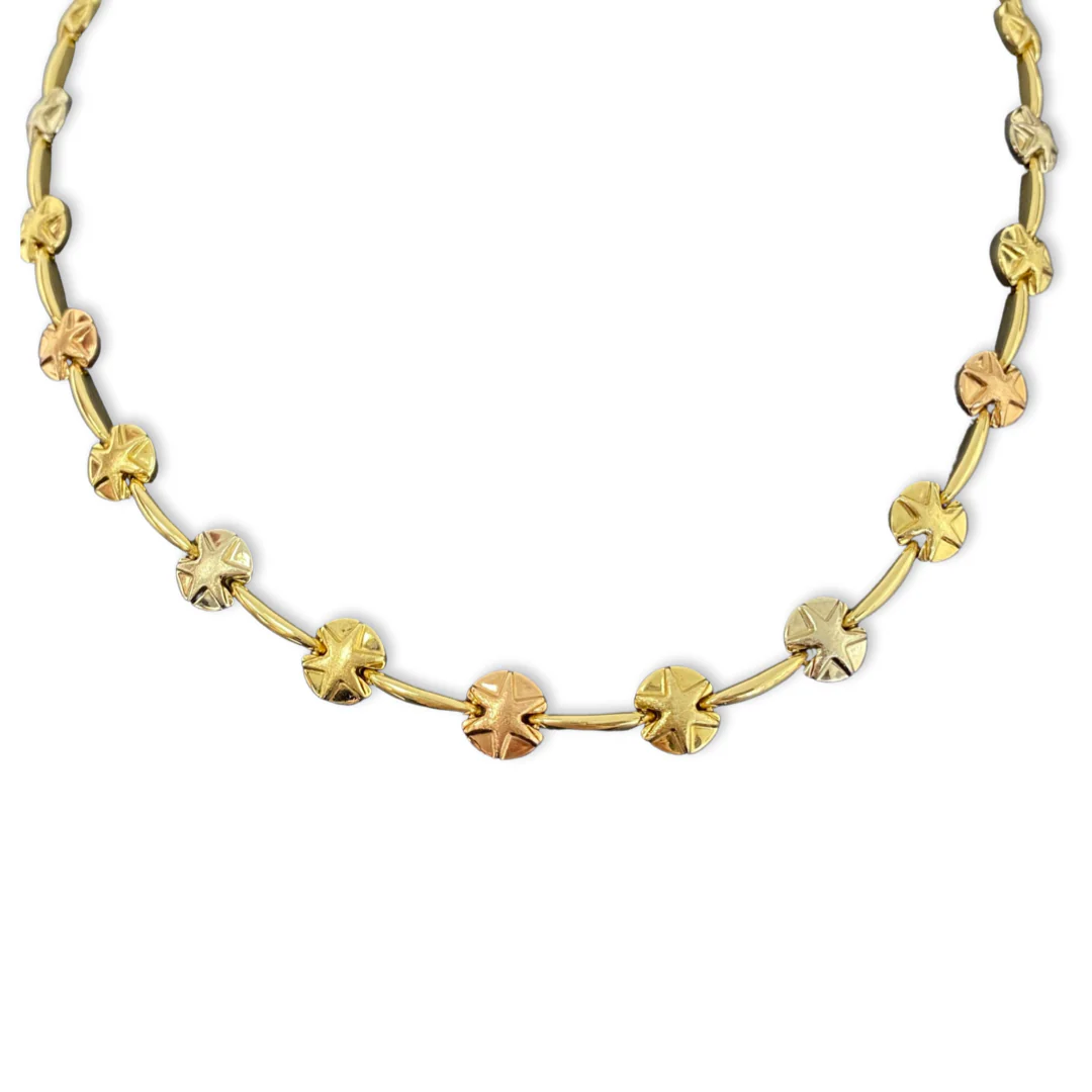 This luxurious Women’s Fancy Tri-Color Star Necklace Set is crafted with 18K Gold weighing 39.5 grams total. Necklace features 17 inches, weighing 26.6 grams. Bracelet measures 7.5 inches, weighing 12.9 grams. Show off your opulent style with this magnificent set.